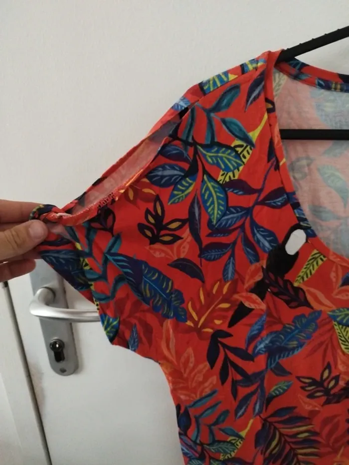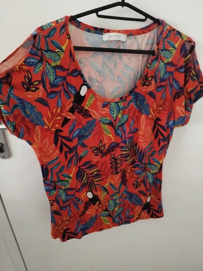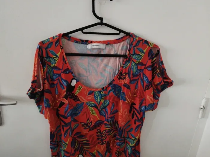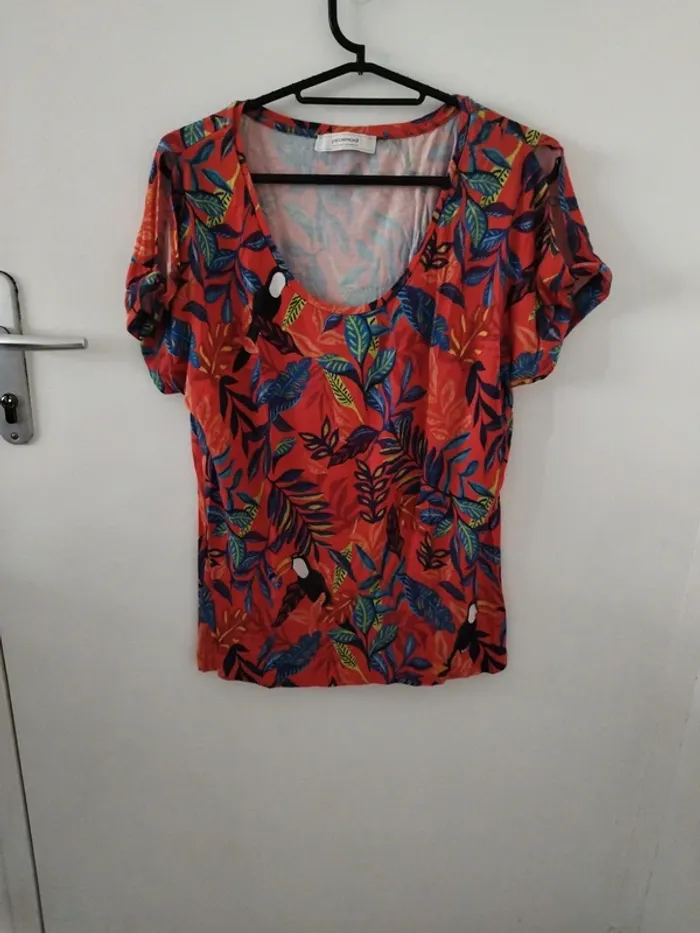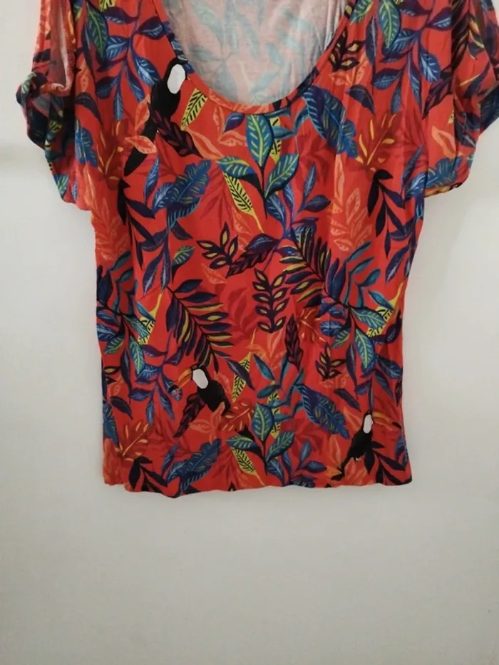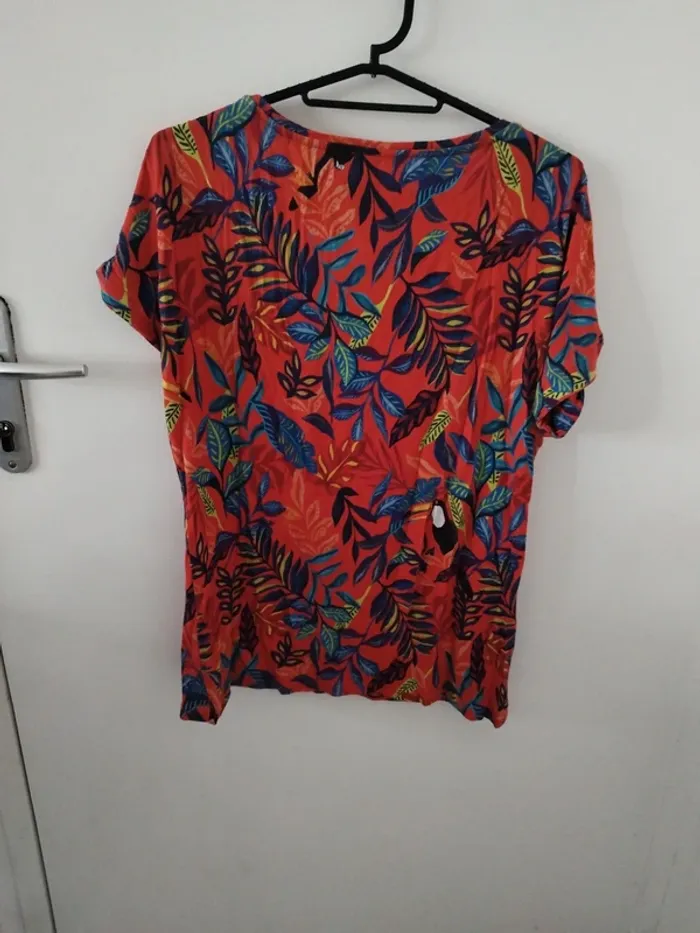 Tee shirt manches courtes femme motif tropical. Ajouré sur les manches.