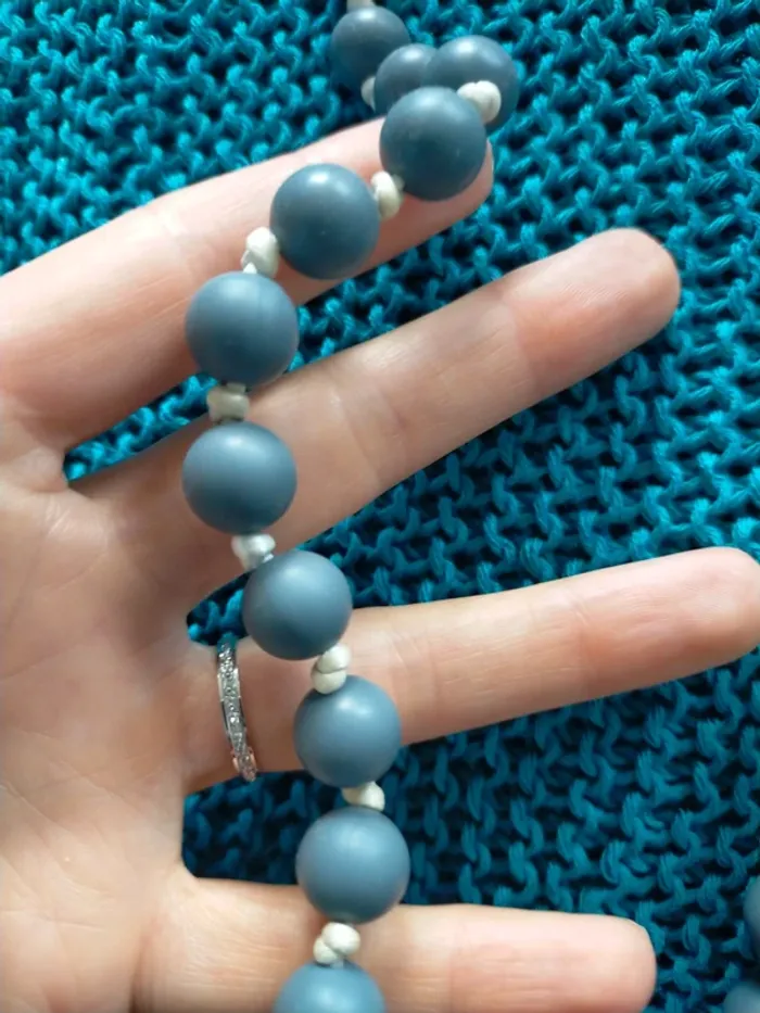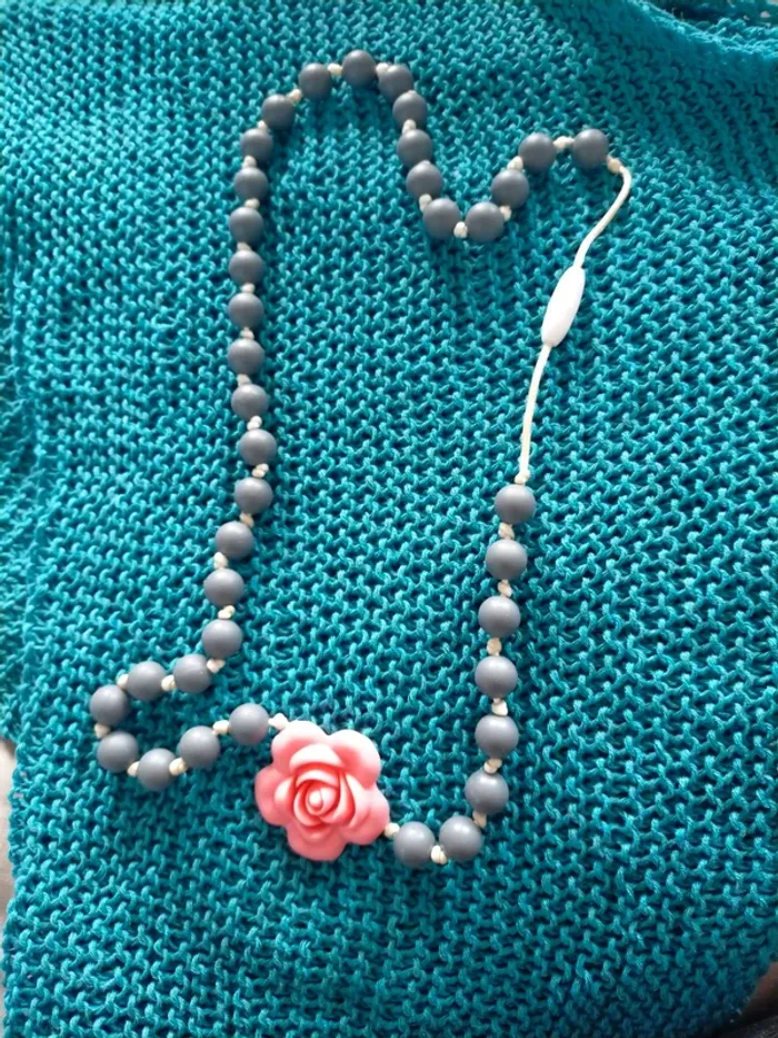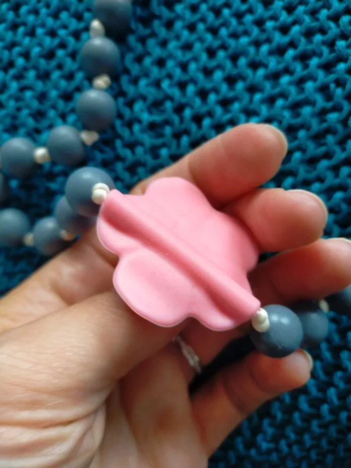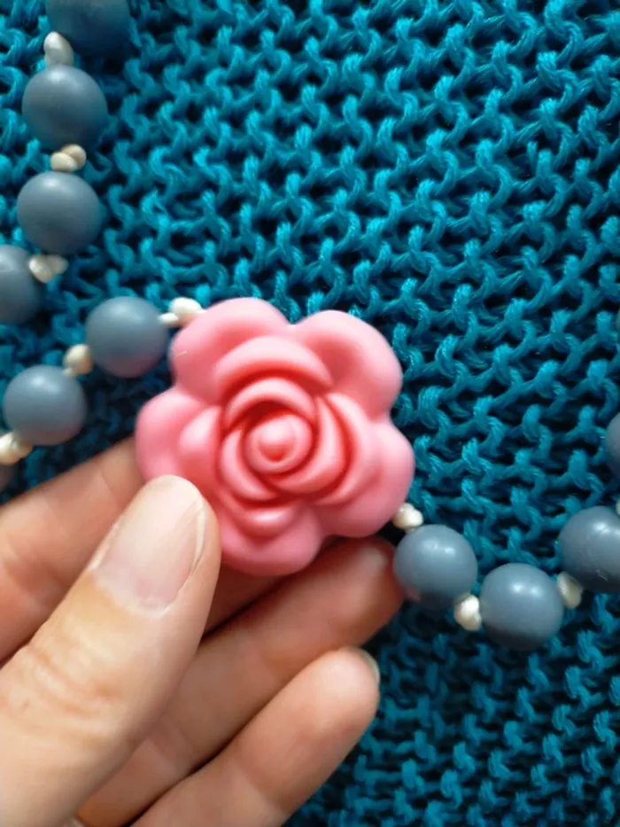 Perles en silicone. Excellent état. Perles grises et petite fleur rose