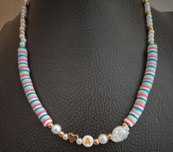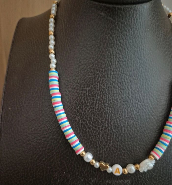 Ajoute une touche de fun et de tendresse à ton look avec ce collier perlé personnalisable avec l’initiale de ton choix ! Fabriqué à la main avec des perles heishi multicolores, des perles nacrées et dorées, une petite fleur et un joli cœur doré, ce collier est à la fois original et plein de charme. Offre-le ou fais-toi plaisir avec un bijou unique, à ton image ! Tu choisis : La lettre (A-Z) Les couleurs dominantes si tu le souhaites (je m’adapte à tes envies) Détails : Fermoir type mousqueton Matériaux : perles acryliques, métal doré Léger, coloré et confortable Bijou fait main avec soin Envoi rapide et emballage soigné. N’hésite pas à me contacter pour toute demande spéciale !