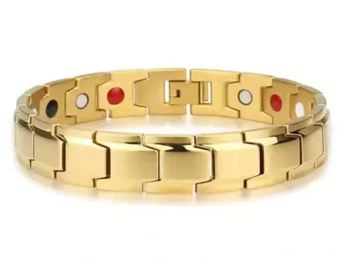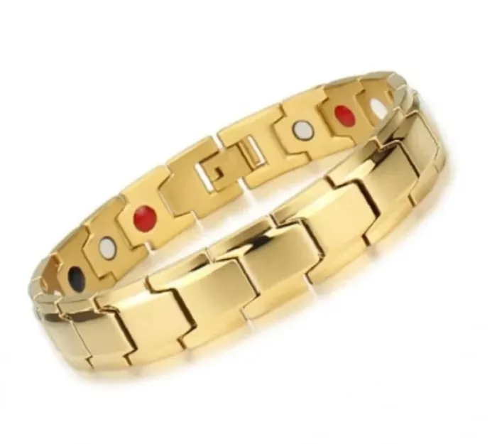 PRODUIT NEUF Nom: 1 Bracelets Couleur: Or-couleur Taille: 1.2cm * 20.5cm Matériau: alliage de zinc, aimant Poids: 37g (erreur d'environ 2 grammes) Paquet: Sac OPP Ne pas porter sous la douche Précautions: Imperméable
