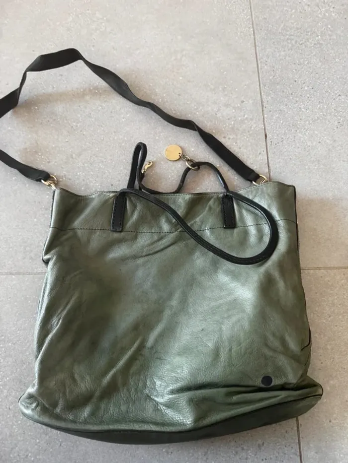 Sac fourre tout vert en cuir Rabeanco, il y a plusieurs marques d'usures, 40x32cm - photo numéro 5