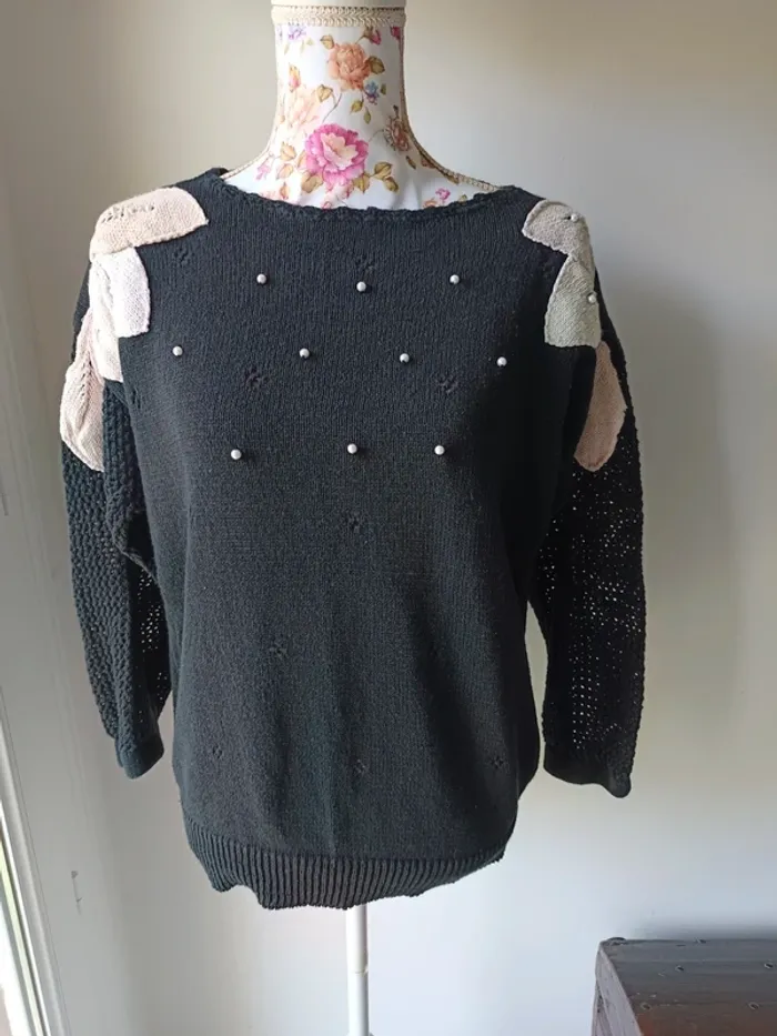 Pull en très bon état. Jolis détails de fleurs en crochet et perles.