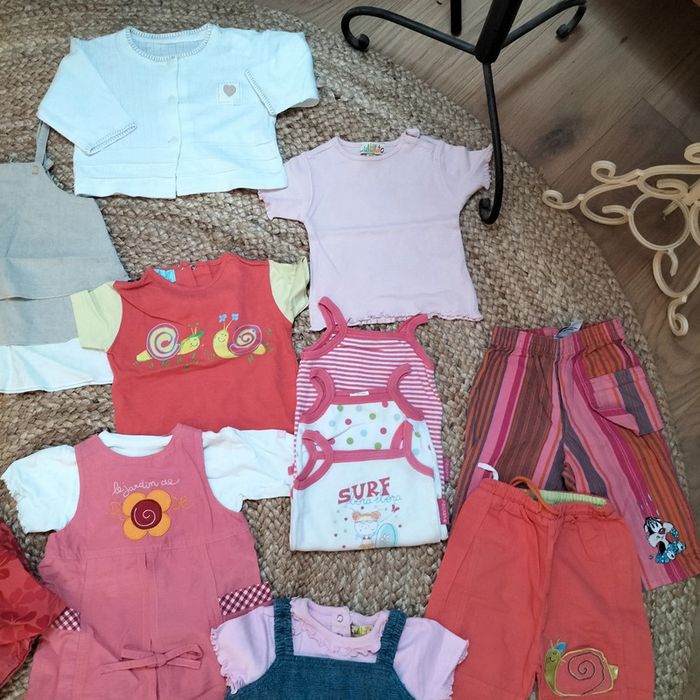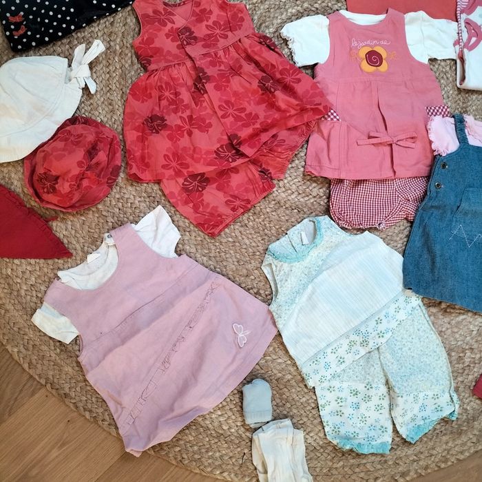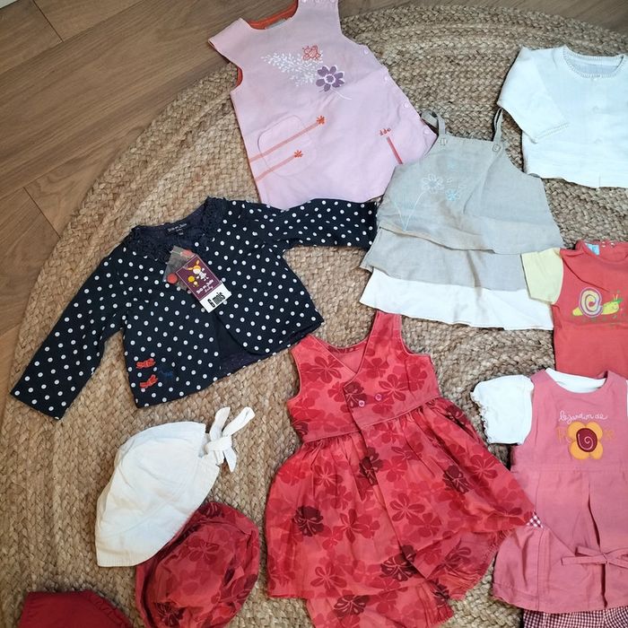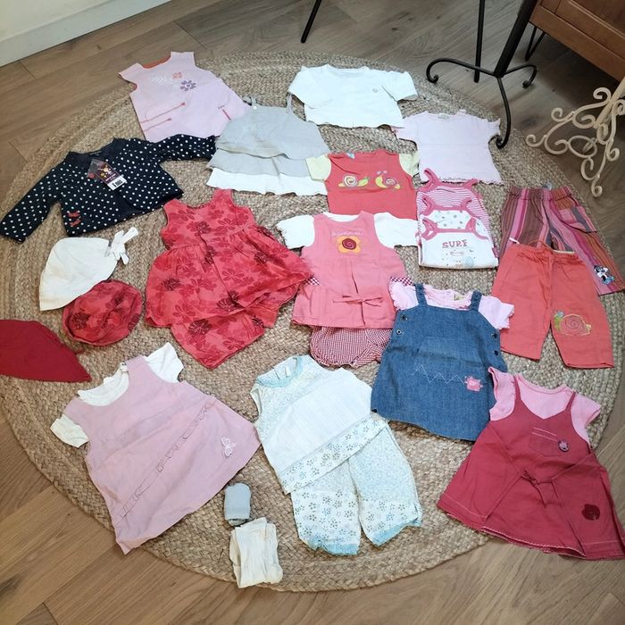 Lot été composé de : 3 bodies a bretelles 6 ensembles robe + t-shirts + accessoire pour certains 2 robes 2 pantalons 2 gilets 2 tshirts 2 chapeaux 1 fichu 1 gilet 1 paire de chaussettes 1 paires de collants opaque blanc Marques : sucre d'orge, absorba, Bambino, culbuto... #stephmailfille6mois Regardez le reste de mon dressing, vous trouverez sans doute une pièce à assortir et profiterez de réductions...😉🎁