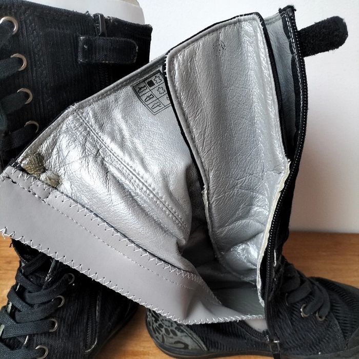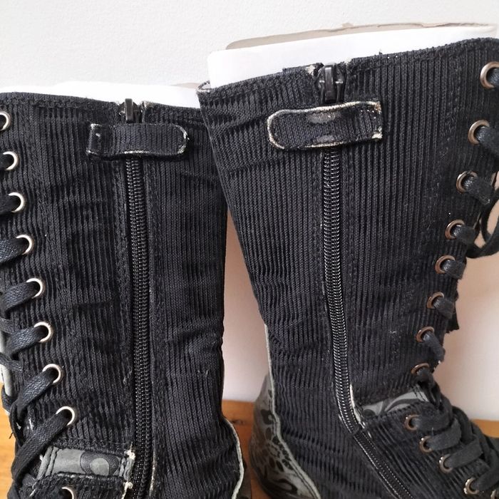 Bottes en velours côtelé noir avec détails en cuir bronze Entièrement doublées cuir Zip sur toute la longueur de la botte Légère traces d'usure au talon et sur le "stop" fermeture #stephmailchaussures Regardez le reste de mon dressing, vous trouverez sans doute une pièce à assortir et profiterez de réductions...😉🎁