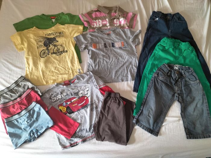 lot composé de 3 t-shirts manches courtes 1 polo manches courtes 2 pantalons 1 bermuda 1 pyjama 3 boxers Marques : tissaia, Kiabi, Disney Pixar cars.... #stephmailgarcon6ans Regardez le reste de mon dressing, vous trouverez sans doute une pièce à assortir et profiterez de réductions...😉🎁