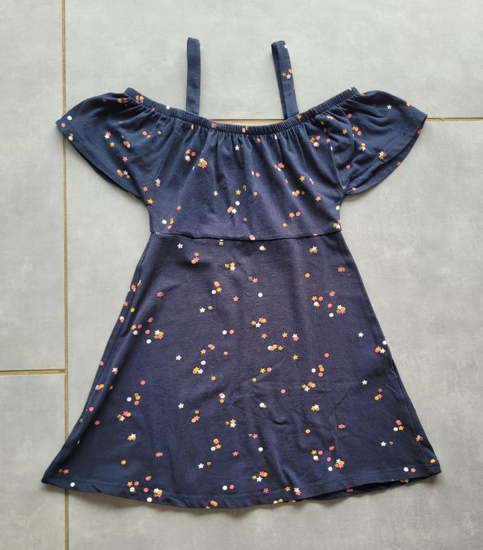 Robe épaules dénudées, de couleur marine avec motifs colorés, de la marque Kiabi, taille 5 ans (108-113 cm), en très bon état. Article lavé pour la vente.
