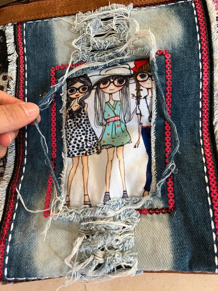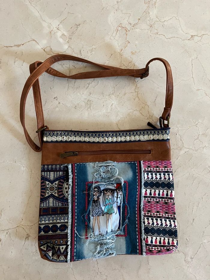 Neuf Sac bandoulière bohème en jean Sac unique mêlant jean délavé, tissus ethniques et simili cuir marron, avec patch illustré tendance. Bandoulière réglable, poches zippée, format pratique . Parfait pour un style bohème chic et original.