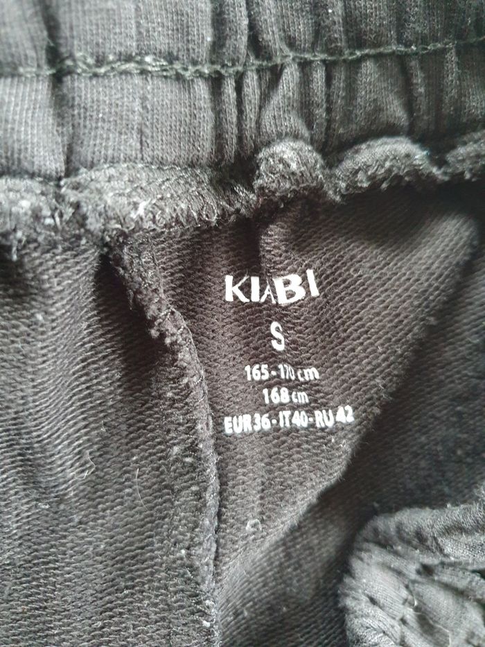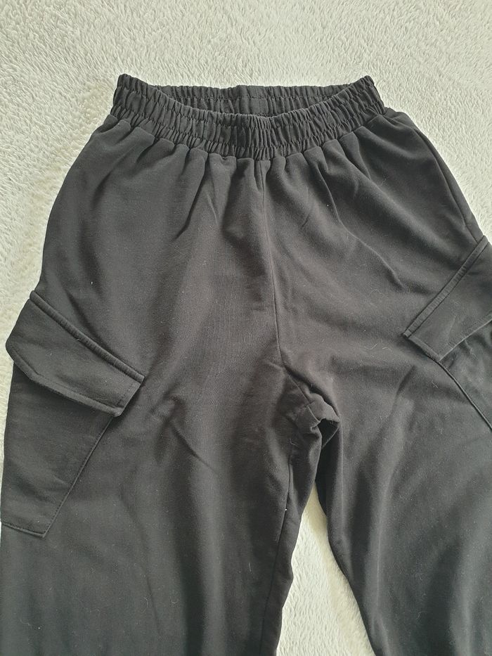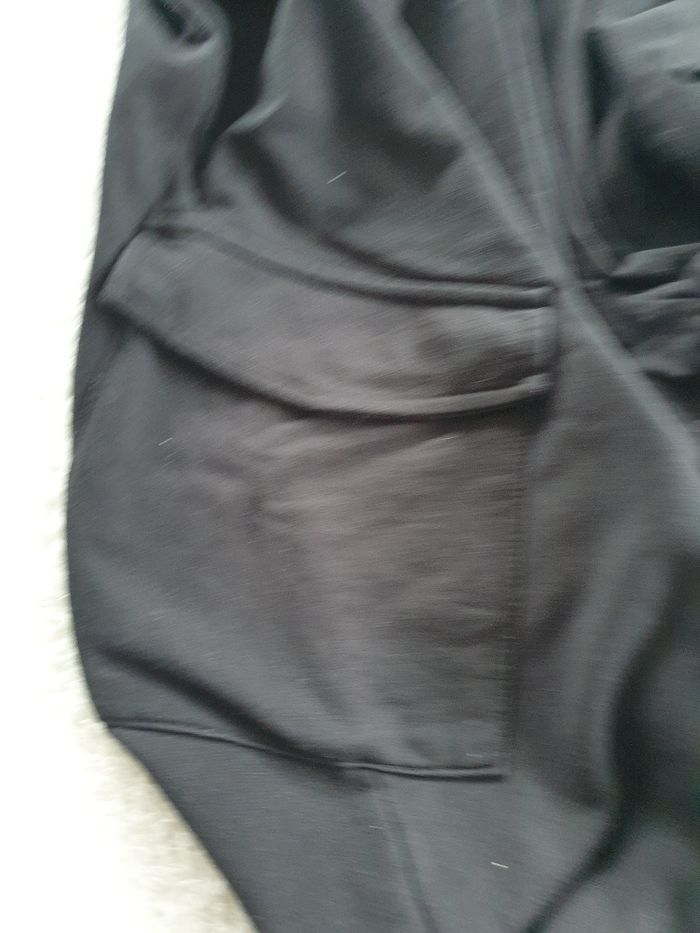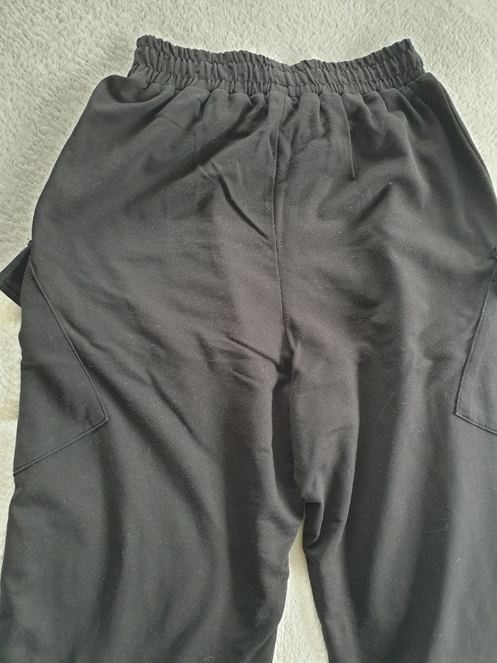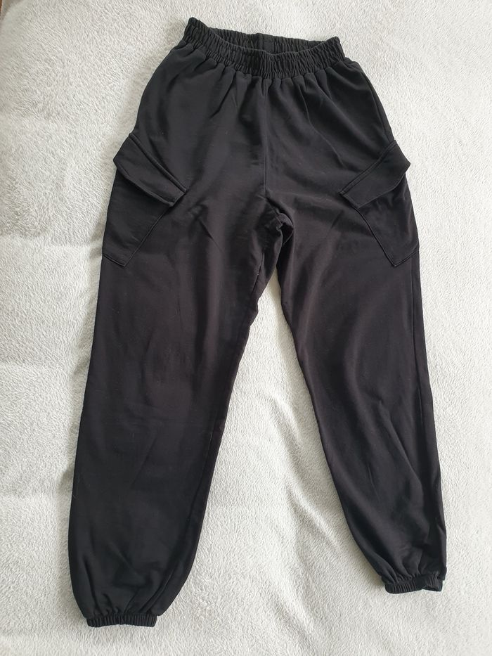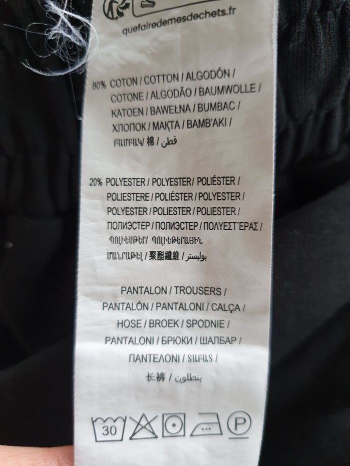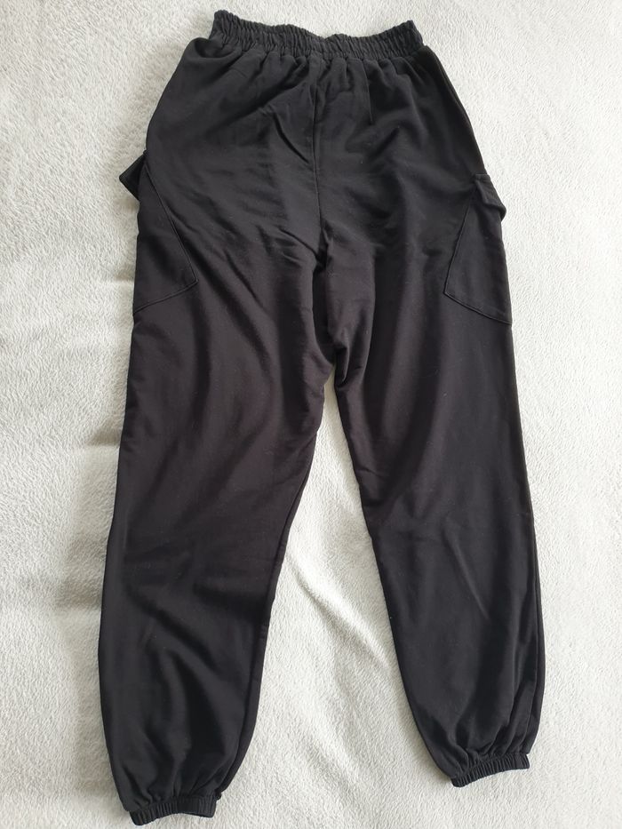 Pantalon femme noir. S. Avec 2 poches sur les côtés. Souple et jambes larges avec élastiques à la taille et aux chevilles.