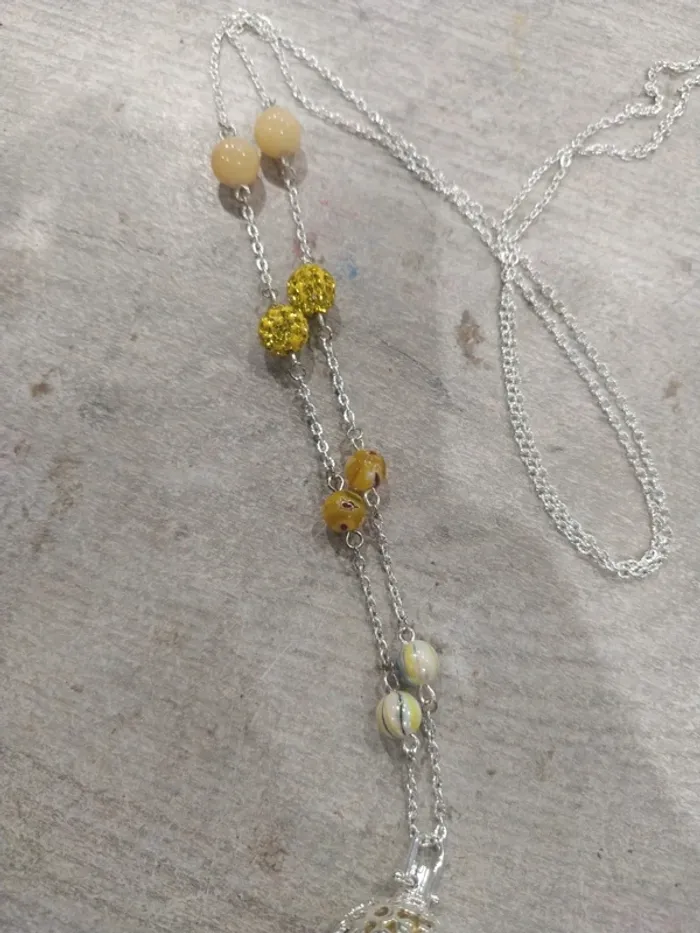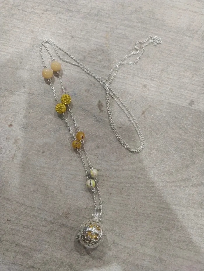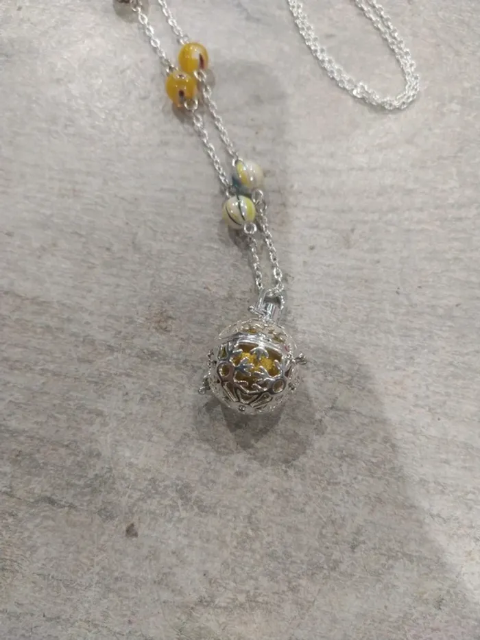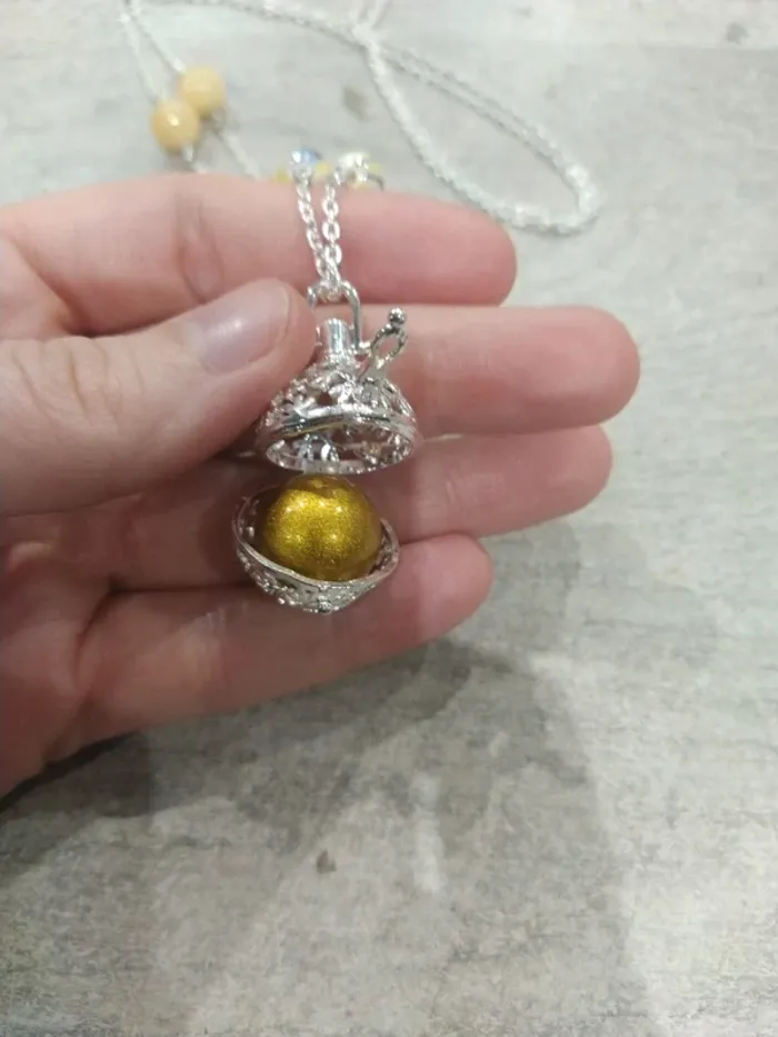 Bola de grossesse confectionné à la mains. Chaque bola n'existe qu'en 1 seul exemplaire pour le rendre unique comme chaque grossesse. Réalisé par une créatrice. Taille de la chaine: 112 cm Taille du bola: 16mm Bola musical pour apaiser bébé avec le son de ses petits grelots. Bola neuf proposé dans une pochette organza et glissé dans une pochette craft papier près à offrir ou à s'offrir. Chaine en métal argenté sans plonc ni nickel. J114