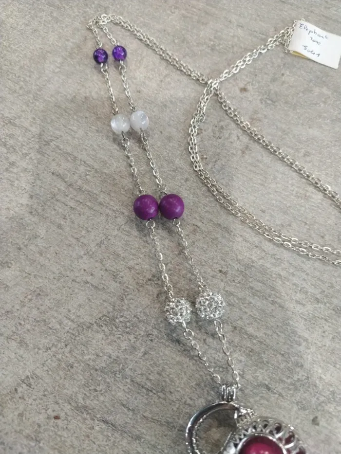Bola de grossesse confectionné à la mains. Chaque bola n'existe qu'en 1 seul exemplaire pour le rendre unique comme chaque grossesse. Réalisé par une créatrice. Taille de la chaine: 112 cm Taille du bola: 16mm Bola musical pour apaiser bébé avec le son de ses petits grelots. Bola neuf proposé dans une pochette organza et glissé dans une pochette craft papier près à offrir ou à s'offrir. Chaine en métal argenté sans plonc ni nickel. J041