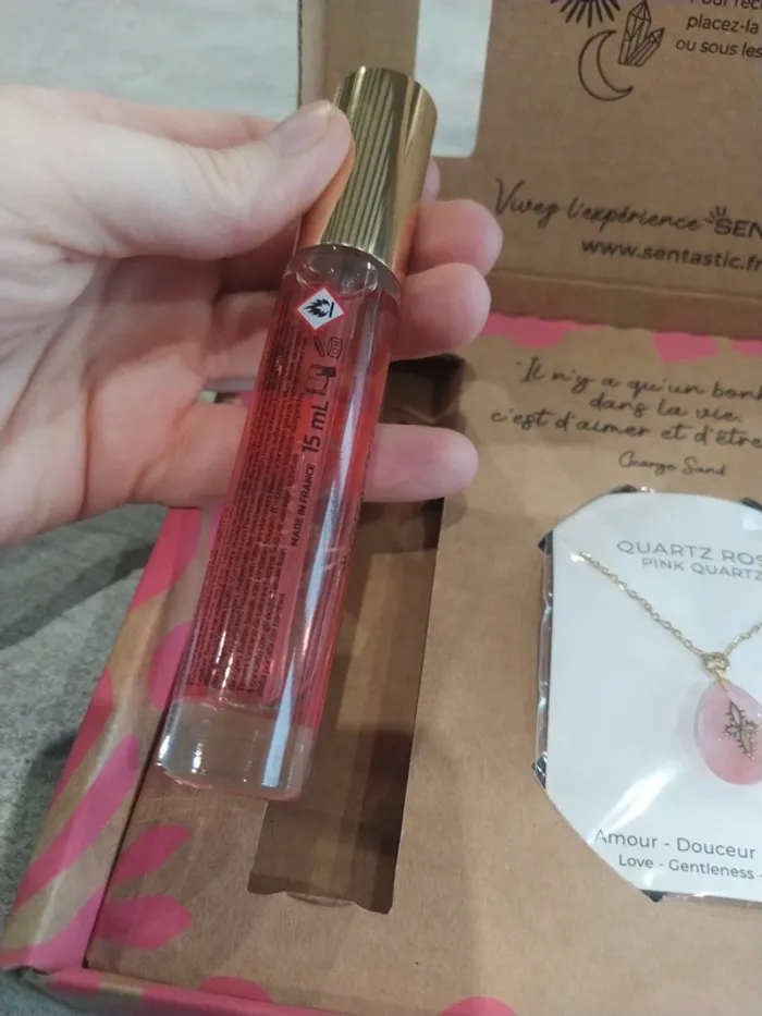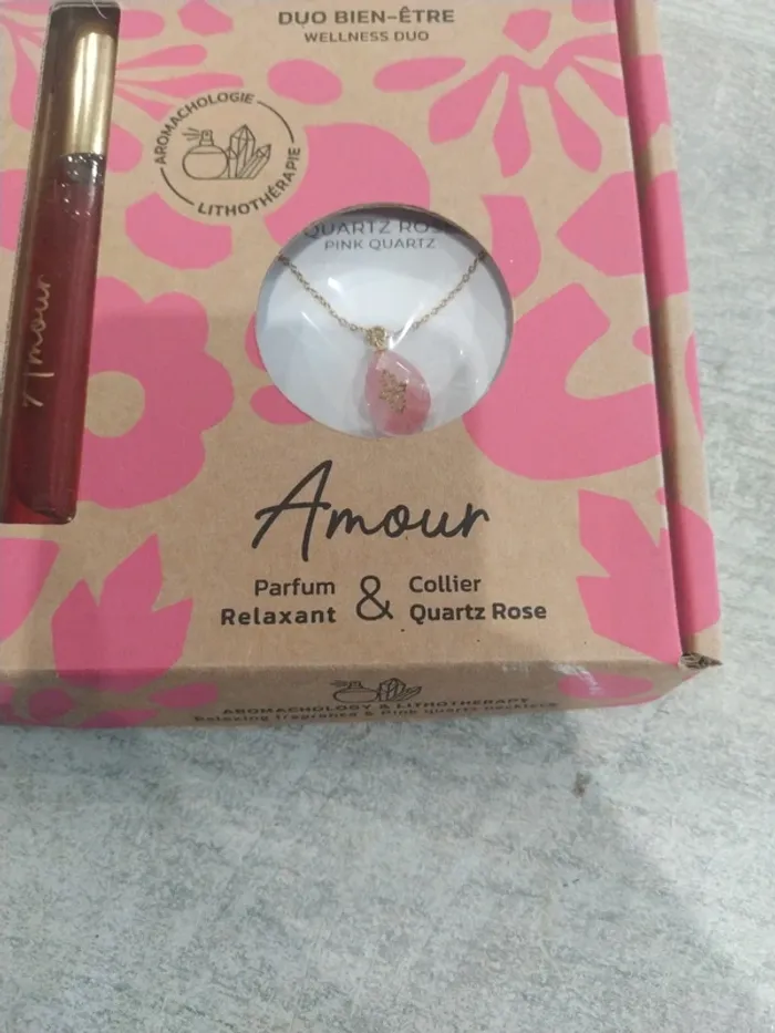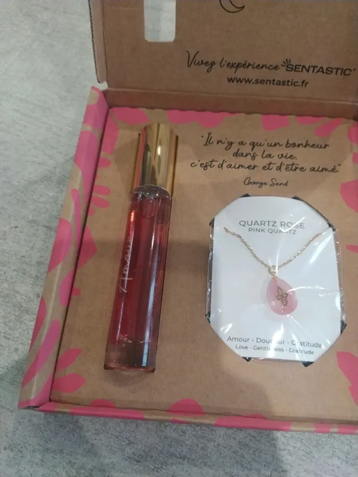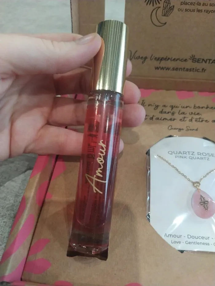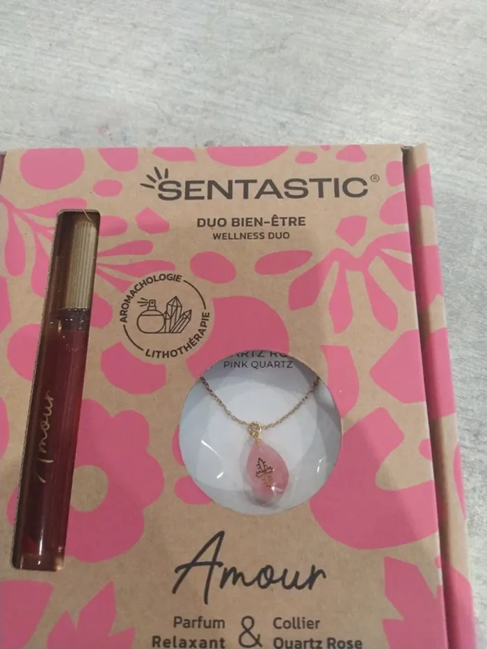 Coffret amour de la marque santastic Composé d'un parfum 15 ml et d'un pendentif en quartz rose Coffret neuf. Parfum non ouvert et non tester, pendentif dans son sachet jamais ouvert