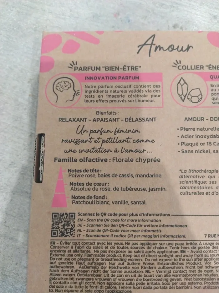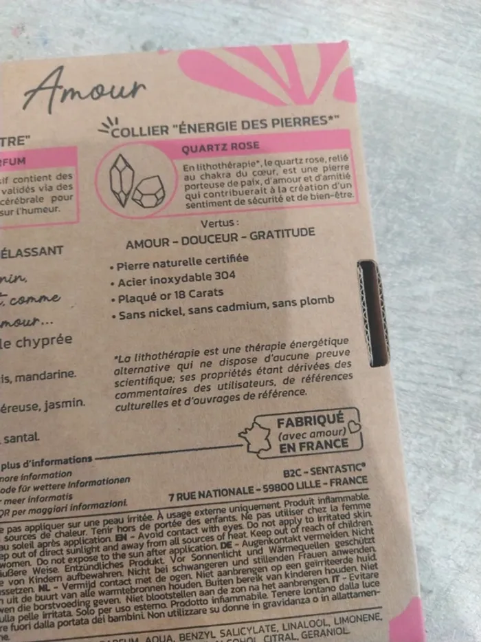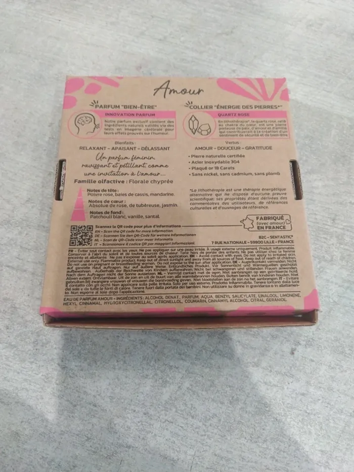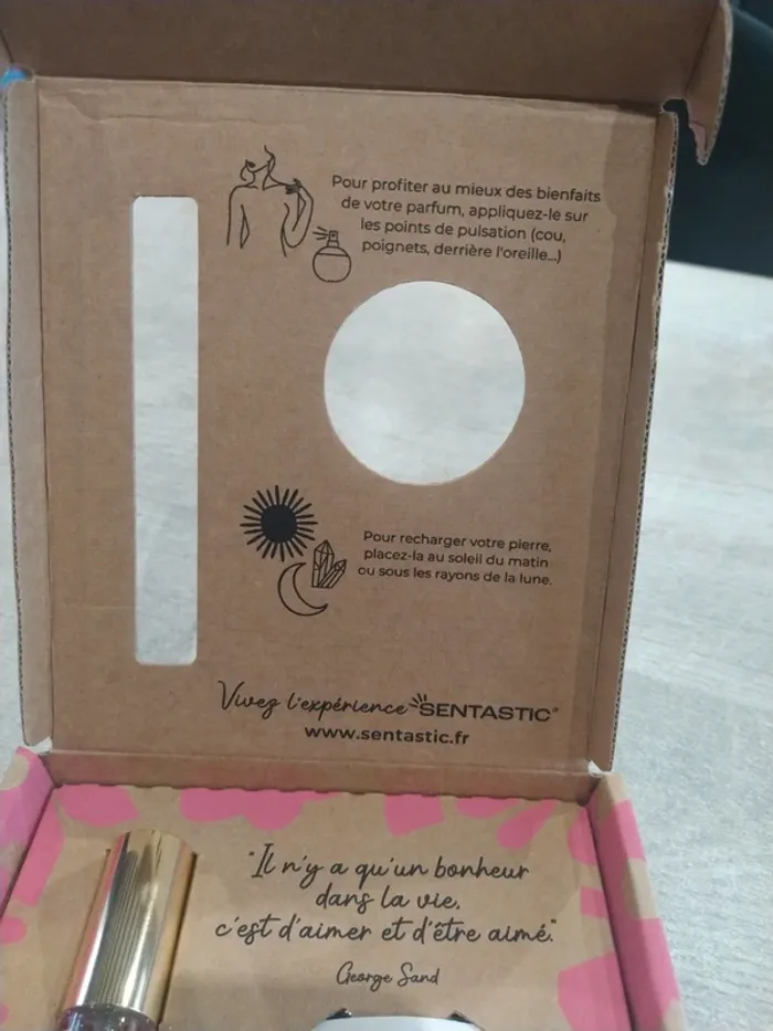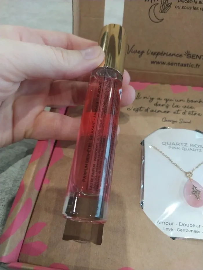 Coffret amour de la marque santastic Composé d'un parfum 15 ml et d'un pendentif en quartz rose Coffret neuf. Parfum non ouvert et non tester, pendentif dans son sachet jamais ouvert