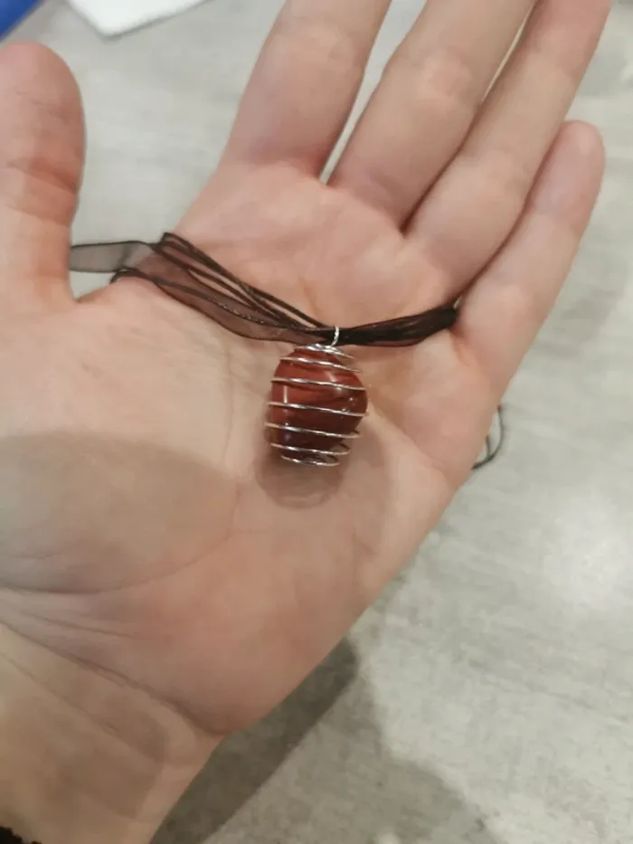 Collier avec une pierre naturelle roulé Pierre: jaspe rouge Collier cordon et organza: marron Longueur du cordon: 45 cm à 49 cm Bijoux neuf non porté Vendu avec la pochette organza
