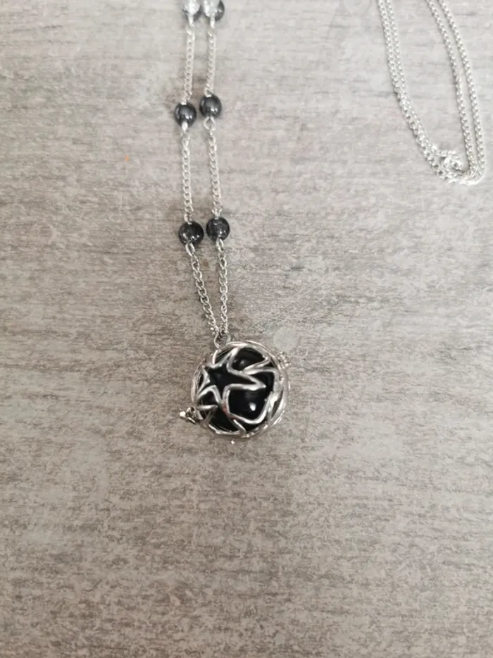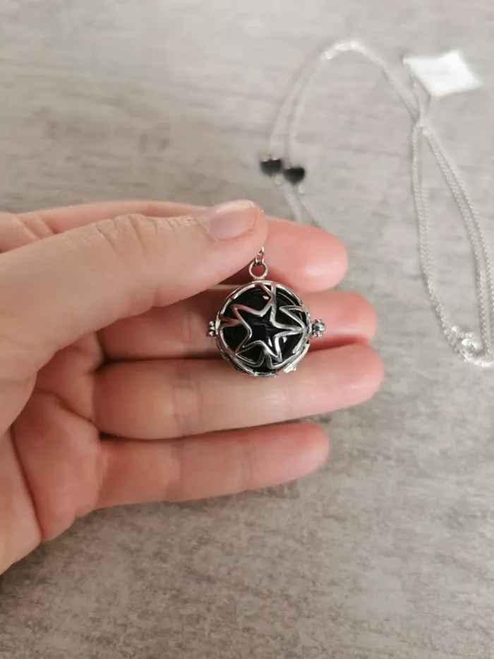 Bola de grossesse confectionné à la mains. Chaque Bola n'a été produit qu'en 1 seul exemplaire pour le rendre unique comme chaque grossesse. Réalisé par une créatrice. Taille de la chaine: 112 cm Taille du bola: 18 mm Bola musical pour apaisé bébé avec le son de ses petit grelot. Bola neuf proposé dans une pochette organza et une pochette craft près à offrir ou à s'offrir. Chaine en métal argenté sans plonc ni nickel. J085