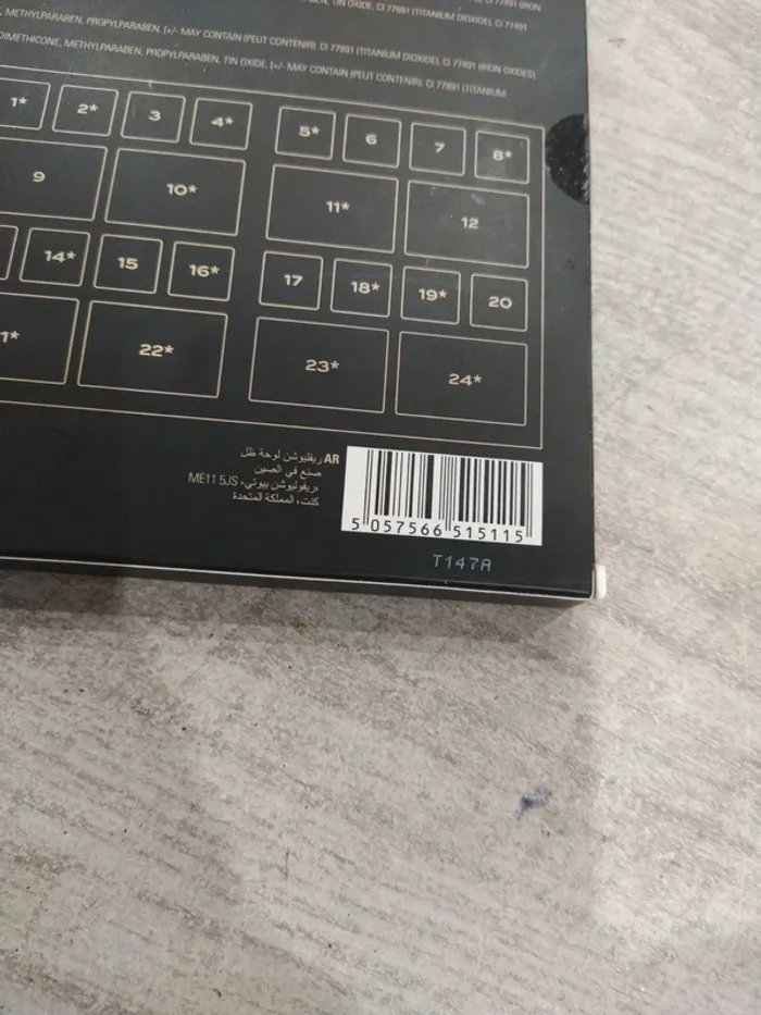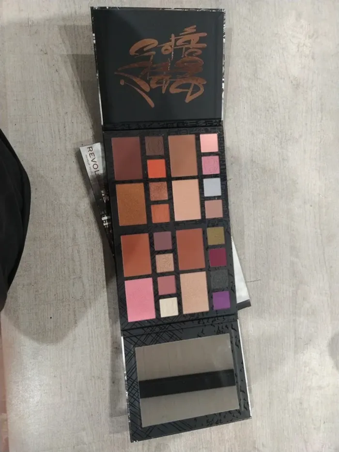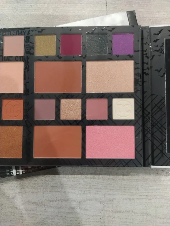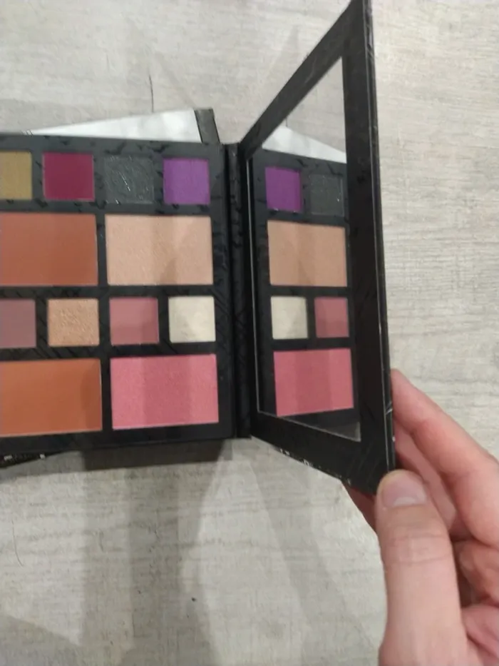 Palette de fard visage Contient: - 16 fard à paupière de 1,7g - 8 blush et highlighter de 5 g Palette neuve. Sortie du carton juste pour les photo, non testé et non swatcher, films plastique sur l'ensemble des fards. (Format moyen poids de la palette seul 620g)