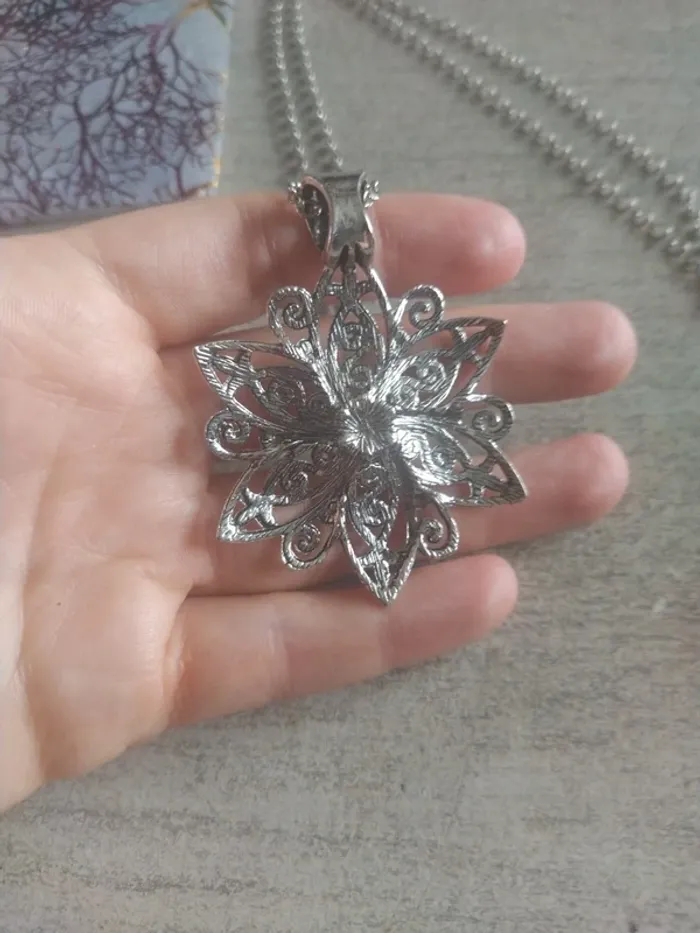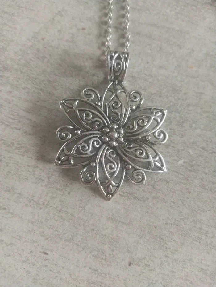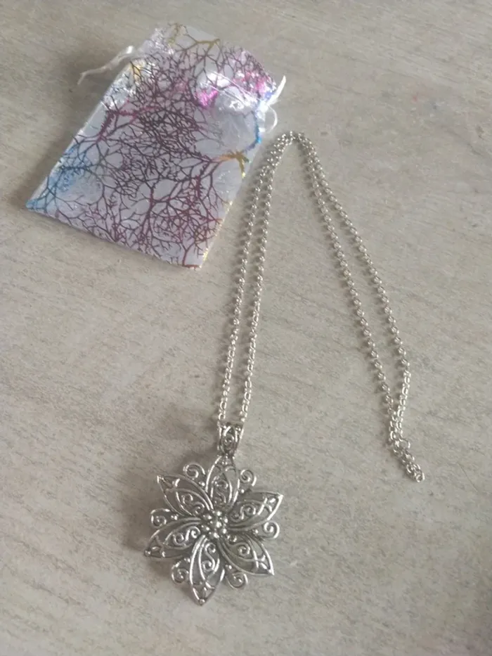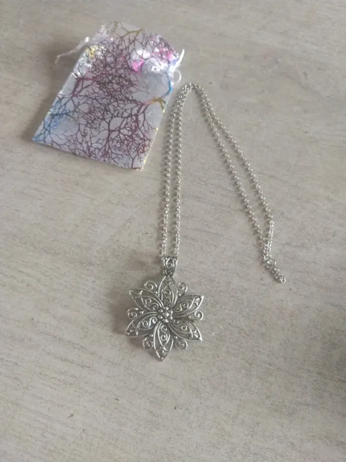 Collier sautoir fantaisie fleurs argenté Taille de la chaîne 70 cm Neuf jamais porté