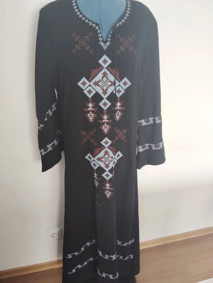 Robe/abaya Couleurs : noir/bleu/marron Taille M Jolies broderies Coupe légèrement évasée Manque un fil au niveau du col mais ne gêne en rien Très bon état