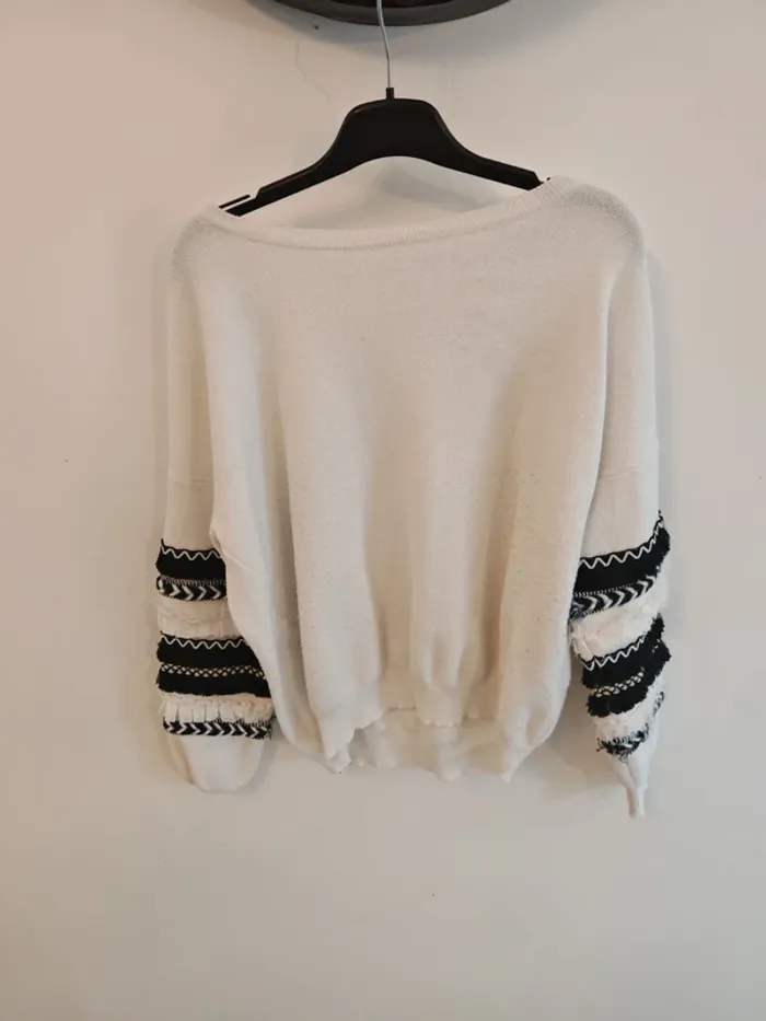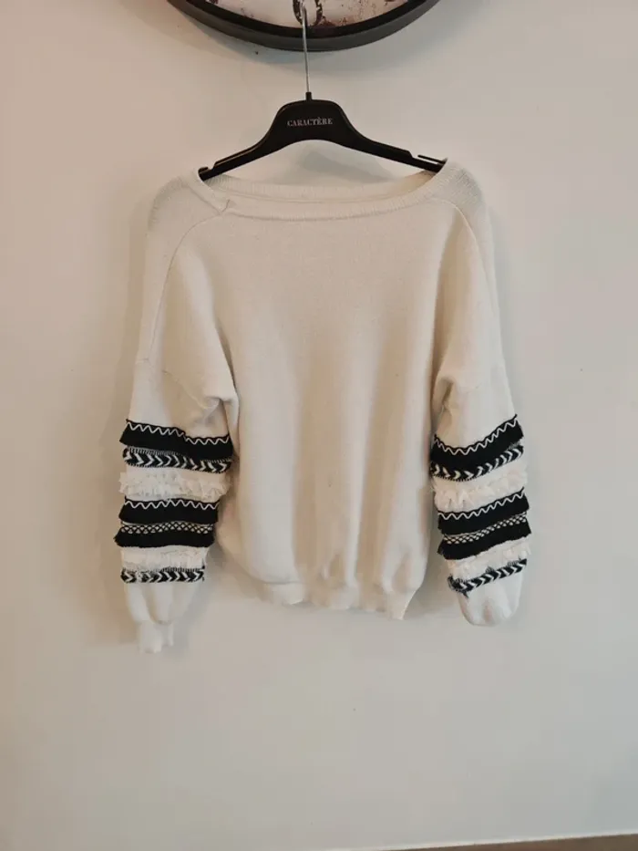 Pull blanc à manches bouffantes Pas d'étiquette de taille mais correspond à du 42 En bon état car présence de bouloches ↪️ N'hésitez pas à créer un lot pour obtenir une réduction 🤗