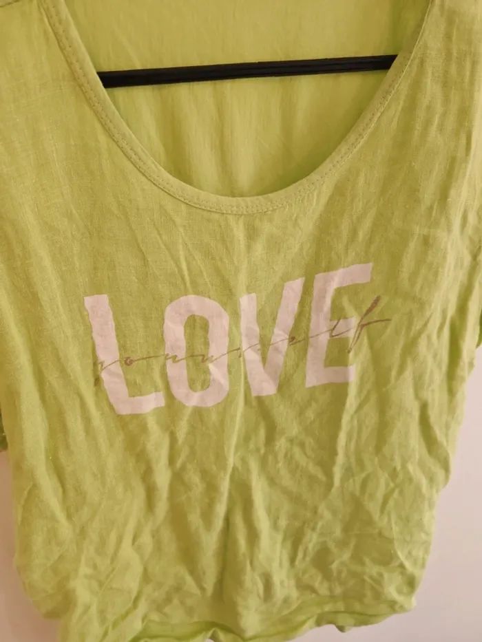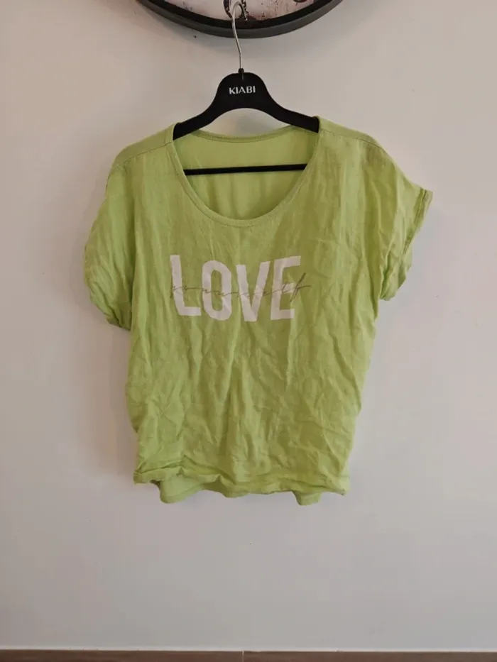 T-shirt vert avec inscription "love" en lin et coton. taille 44 ↪️ N'hésitez pas à créer un lot pour obtenir une réduction 🤗