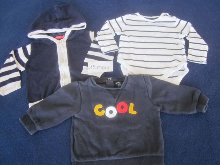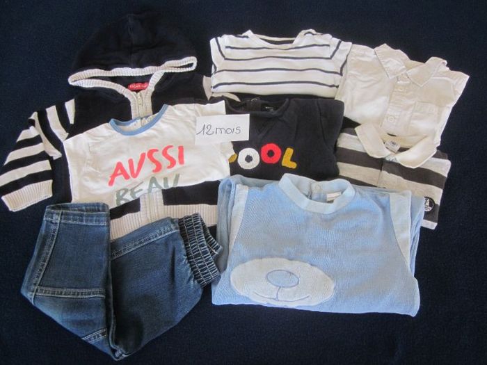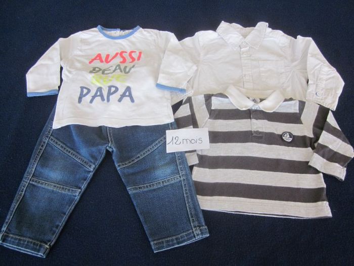 12m, gilet à capuche + sweat + body ml + chemise + polo + jean + haut ml (légère auréole) + pyjama offert (manque une pression au dos), petit bateau, kitchoun, tissaia