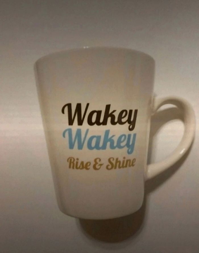 Je vends ce mug blanc avec l'inscription "Wakey Wakey Rise & Shine". - Type de produit : Mug - Couleur : Blanc - Motif : Texte imprimé Très bon état N'hésitez pas à me contacter pour plus d'informations ou de photos.