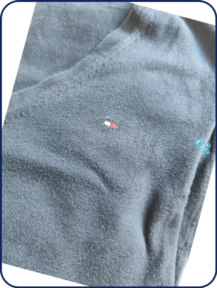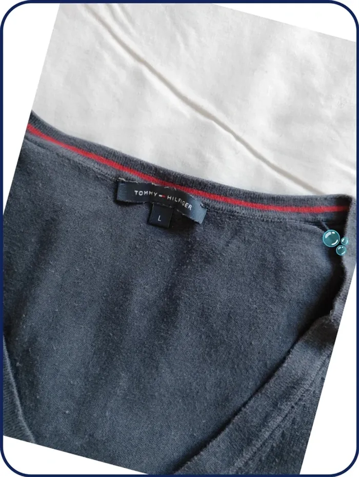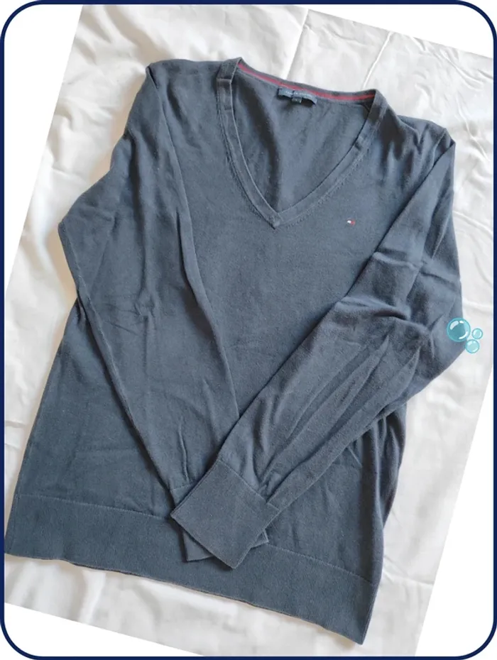 Pull bleu marine Tommy Hilfiger Écrite taille L mais assez moulant donc je le met volontairement dans la catégorie de taille M Assez bon état Pas de tâche ni de trou. Petit prix.