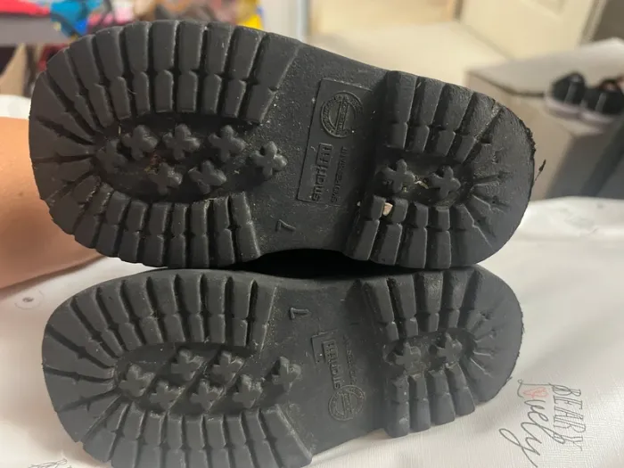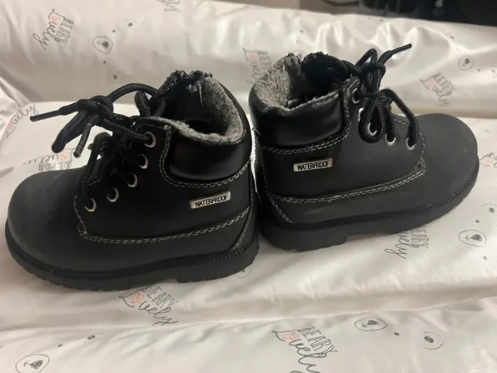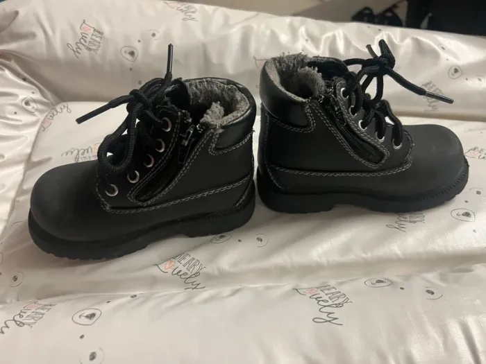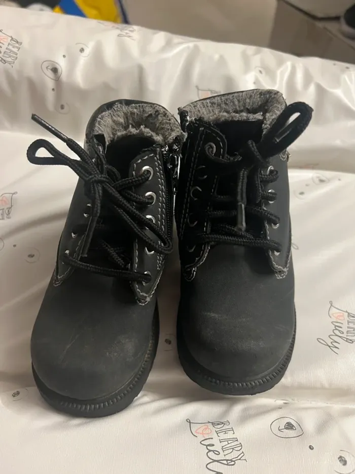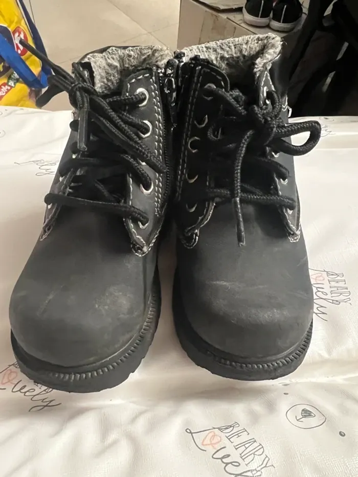 Bottines garçon en bon état, voir les traces d’usures sur les photos. Elles sont noires.