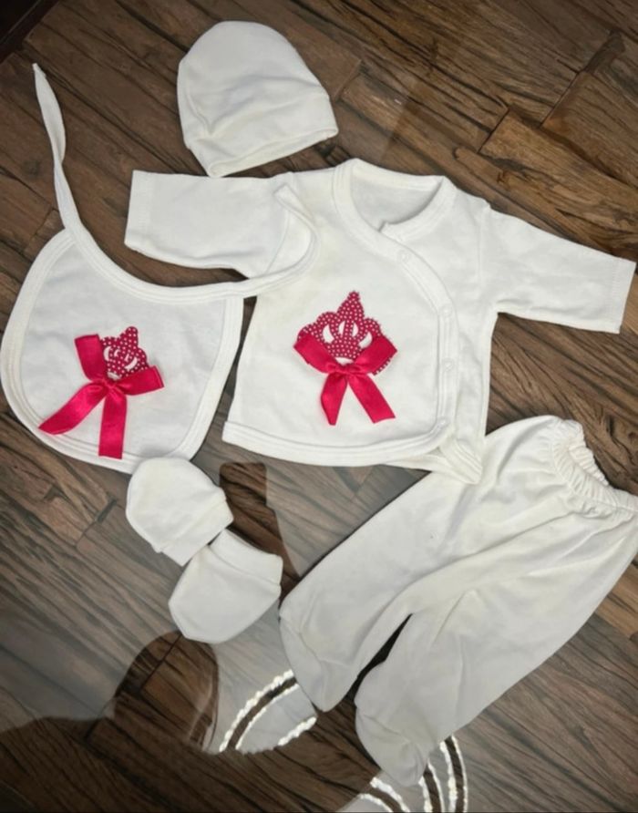 Mondial relais uniquement Ensemble 1-3 mois couronne rose idéal pour faire broder le prénom 5 pièces haut bas bonnet bavoir et gant deux mini tache j’ai du le tacher en le stockant car jamais porté