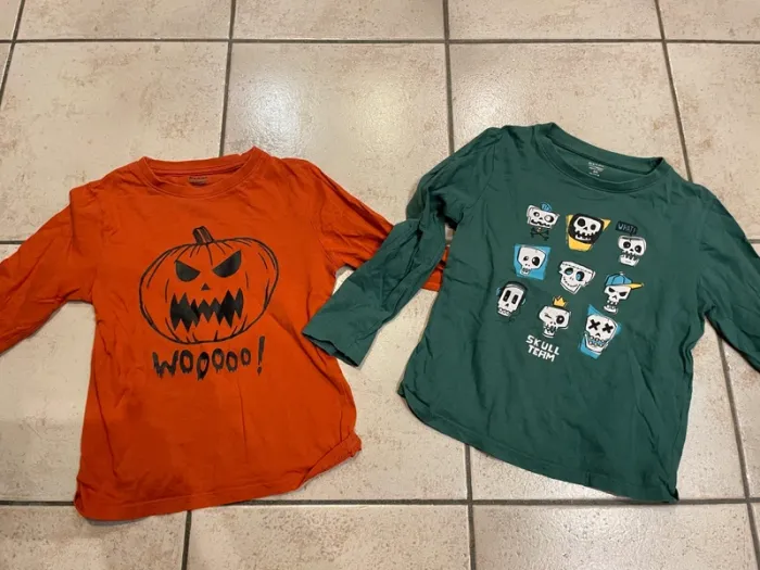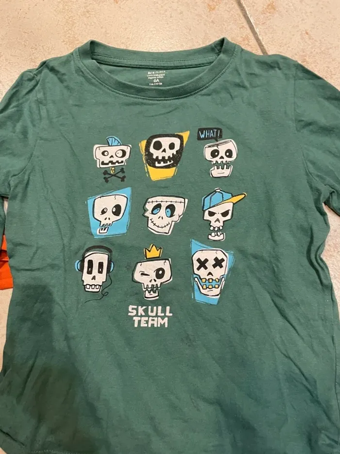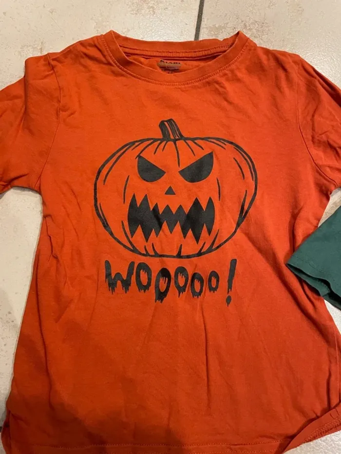 Lot de 2 tee-shirts à manches longues en taille 6 ans Marque Kiabi Un orange avec une citrouille d'halloween, un vert et des têtes de mort rigolotes. 2 tshirts que mon fils a adoré, il les a pas mal portés mais ils restent en bon état. Pour voir tous mes teeshirts en 6ans: (pensez à décocher vos filtres de tailles afin de tout voir) #coraliefromgrenoble_teeshirts6ans