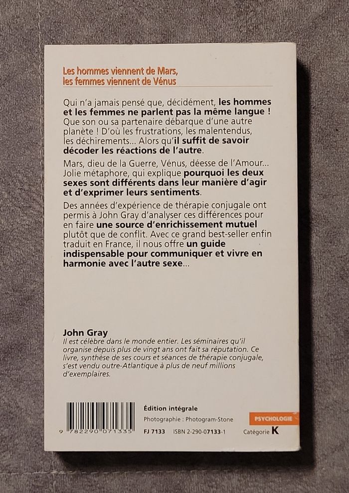 Bonjour, Je vends ce livre nommé - Les Hommes viennent de Mars, les femmes viennent de Vénus John Gray - en très bon état. Si vous rechercher un livre ou un acteur en particulier et pour gagner du temps, n'hésitez pas à me le demander, je vous répondrais dès que possible 😇 Veuillez vous abonner pour recevoir toutes les nouveautés Pour autres infos n'hésitez pas à me contacter. ***** Merci de votre visite *****