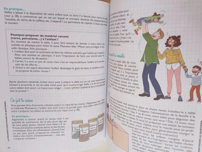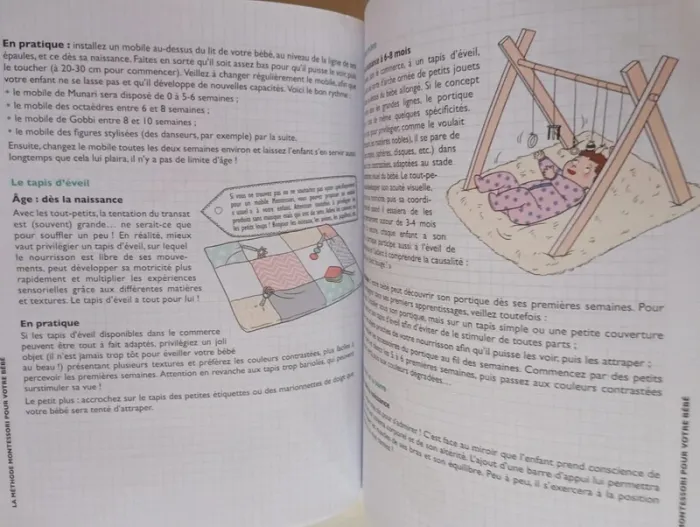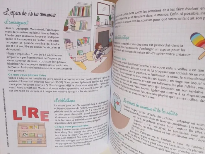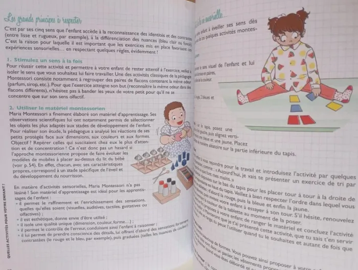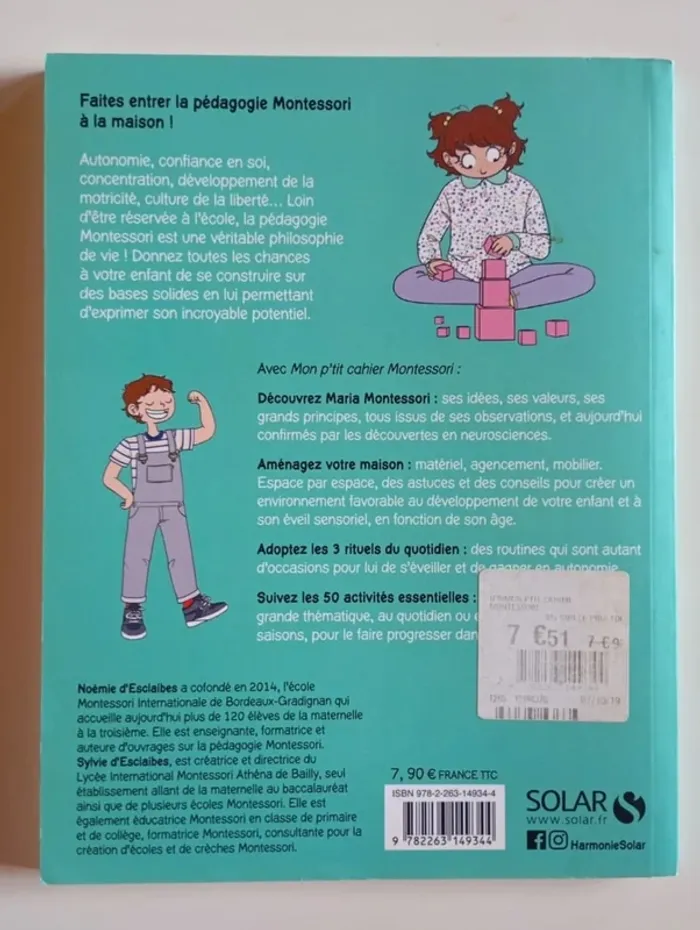 La méthode Montessori comme un nouvel art de vivre à la maison. Devenir autonome, avoir confiance en soi, savoir se concentration, développer la motricité fine et cultiver la liberté. Loin d'être réservée à l'école, la pédagogie Montessori est une véritable philosophie de vie. Elle permet d'acquérir, au cours des premières années cruciales de l'enfant, des qualités essentielles pour qu'il puisse grandir sereinement et s'épanouir. Pour s'approprier ces valeurs, le matériel utilisé par l'enfant, son environnement et une posture bien particulière de l'adulte auprès de lui sont nécessaires. Au programme Comprendre qui était Maria Montessori, ses idées, ses grands principes : périodes sensibles, esprit absorbant, potentiel inné de l'enfant... Les observations faites par Maria Montessori au début du 20e sont aujourd'hui confirmées par les découvertes en neurosciences et viennent bouleverser les méthodes d'apprentissage et plus largement le regard porté sur les enfants. 5 règles d'or du parent montessorien à adopter : s'imprégner de la méthode, ne pas douter, créer un espace de vie adapté à ses besoins et ses moyens, rester à sa place. Des astuces et des conseils simples pour aménager la maison et créer un environnement favorable au développement de son potentiel et à son éveil sensoriel : matériel, agencement, mobilier. Des rituels quotidiens : toilette et habillage, repas, coucher pour adopter les bons réflexes. Les activités à privilégier au quotidien pour favoriser les apprentissages. Éditeur ‏ : ‎ Solar 112 pages Dimensions ‏ : ‎ 17 x 0.9 x 22.1 cm Livre en parfait état Je vends d'autres livres Montessori #phil_peg_montessori #montessori