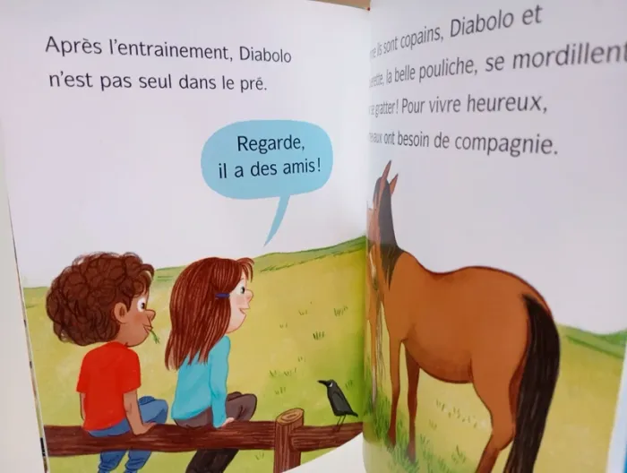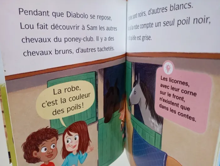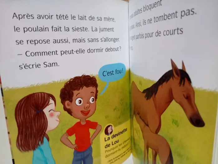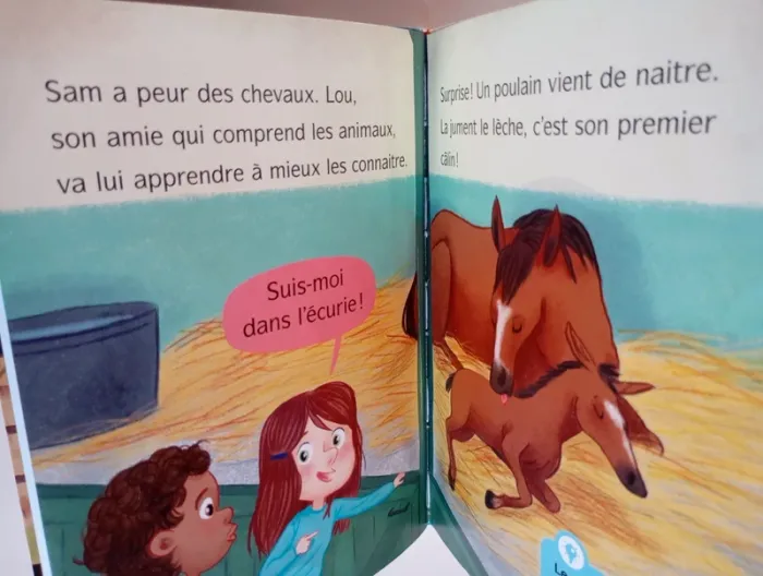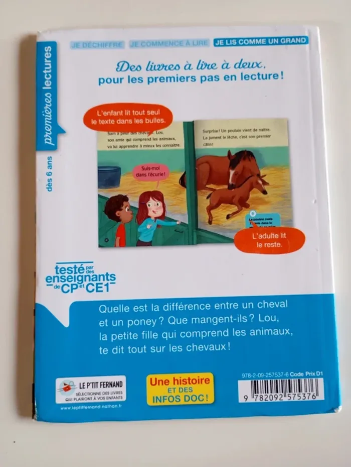 Tout apprendre sur les animaux avec Lou ! Un roman à lire à deux pour les premiers pas en lecture ! L'histoire : Sam a peur des chevaux. Sa copine Lou, qui comprend le langage des animaux, veut l'aider à dompter sa peur. Elle lui fait rencontrer un poulain et lui explique tout sur les chevaux et poneys ! Des histoires qui émerveillent, des aventures riches avec des personnages attachants et des livres durables ! Éditeur ‏ : ‎ Nathan 32 pages Âge de lecture ‏ : ‎ 6 - 8 ans Dimensions ‏ : ‎ 14.7 x 0.7 x 19.2 cm Livre en très bon état (Coins un peu blanchis, très bon état intérieur) Je vends d'autres livres sur les chevaux #phil_peg_cheval ou premières lectures #phil_peg_premiereslectures #animauxdelou #livredoc #chevaux #premièreslectures