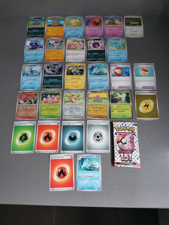 Lot de 29 cartes pokémons écarlate et violet, série 151 Mew. 14 communes dont 3 reverses, 8 peu communes dont 1 en double et 1 reverse, 1 holo rare, 6 énergies dont 1 en double et 1 holo. Neuves sorties du booster.