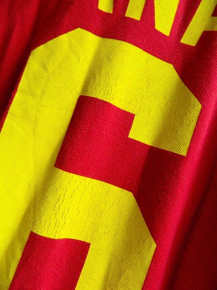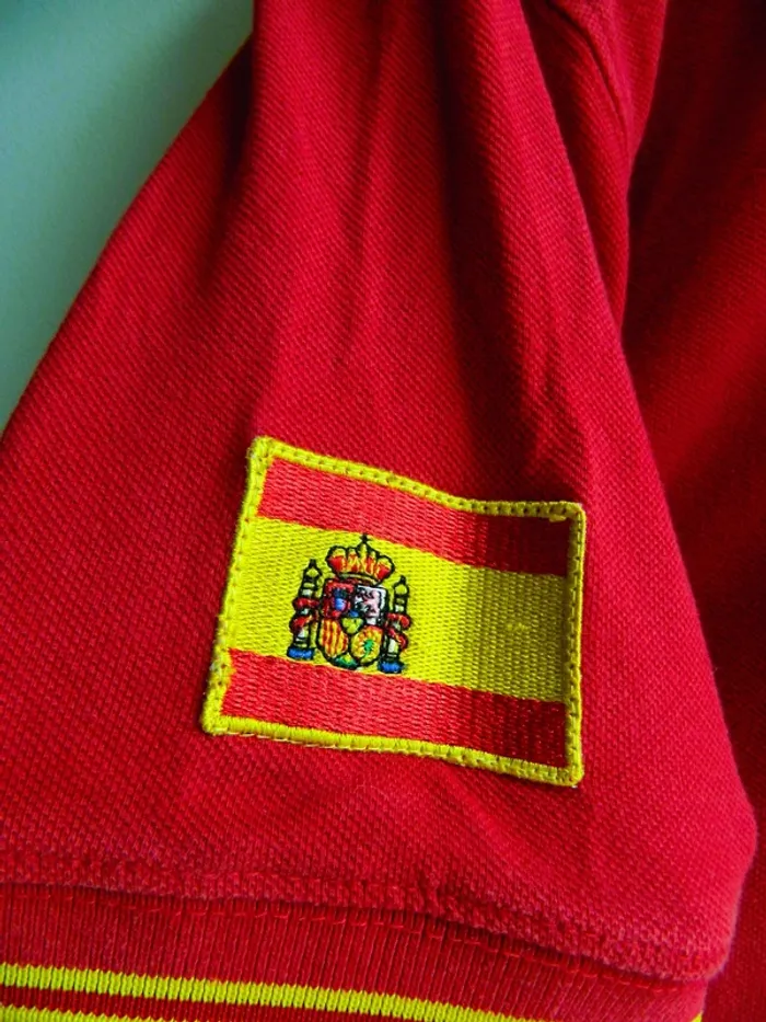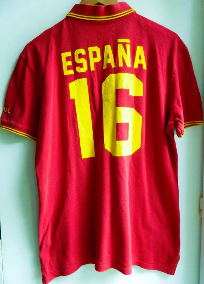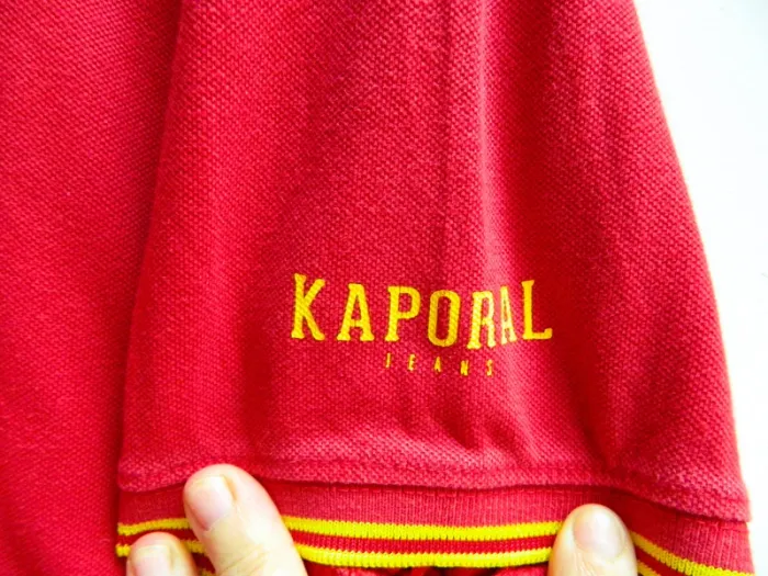Polo manches courtes T L Marque" Kaporal" Rouge et jaune au couleur de l'Espagne Le rouge est un peu passé et le jaune du chiffre est légèrement craqué (voir photo) En coton Envoie sous 48 h