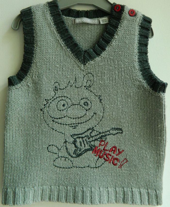 Pull sans manches T 2 ans En acrylique et laine Gris Brodé Boutons sur l'épaule Très bon état Envoie sous 48 h
