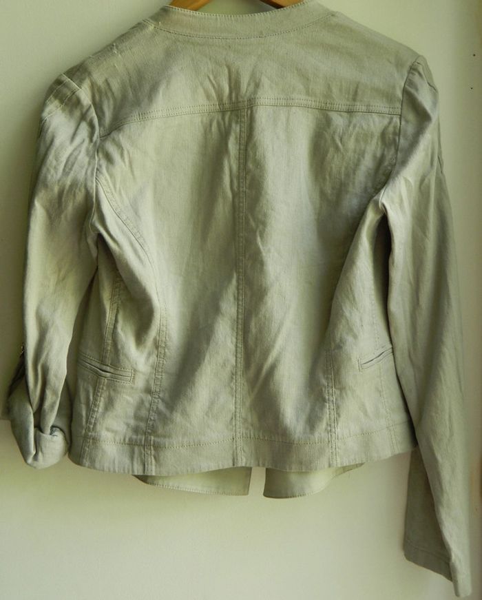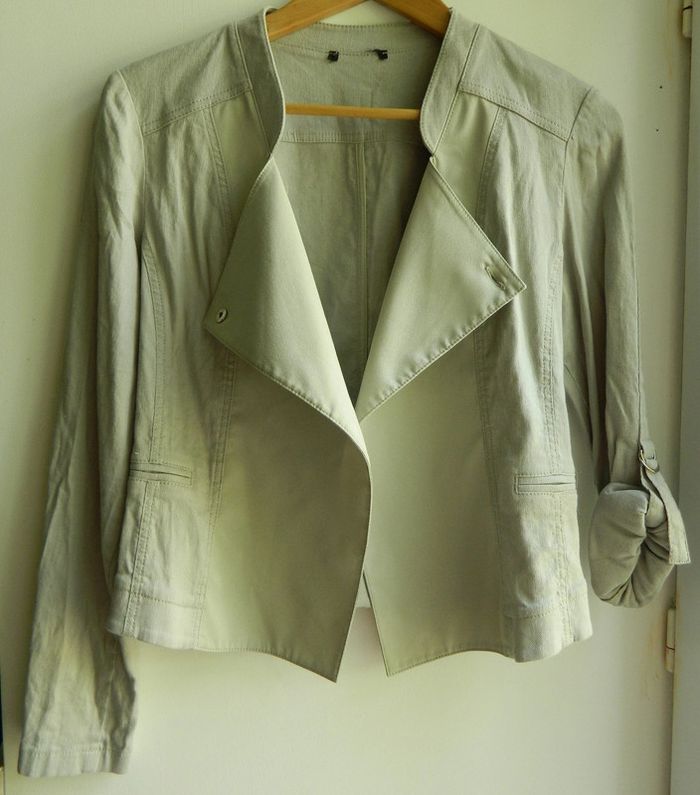 Veste légère d'été T 38 Marque dégriffée Manches retroussables Beige uni Boutons pressions En coton,lin et élasthanne Très bon état Envoie sous 48 h