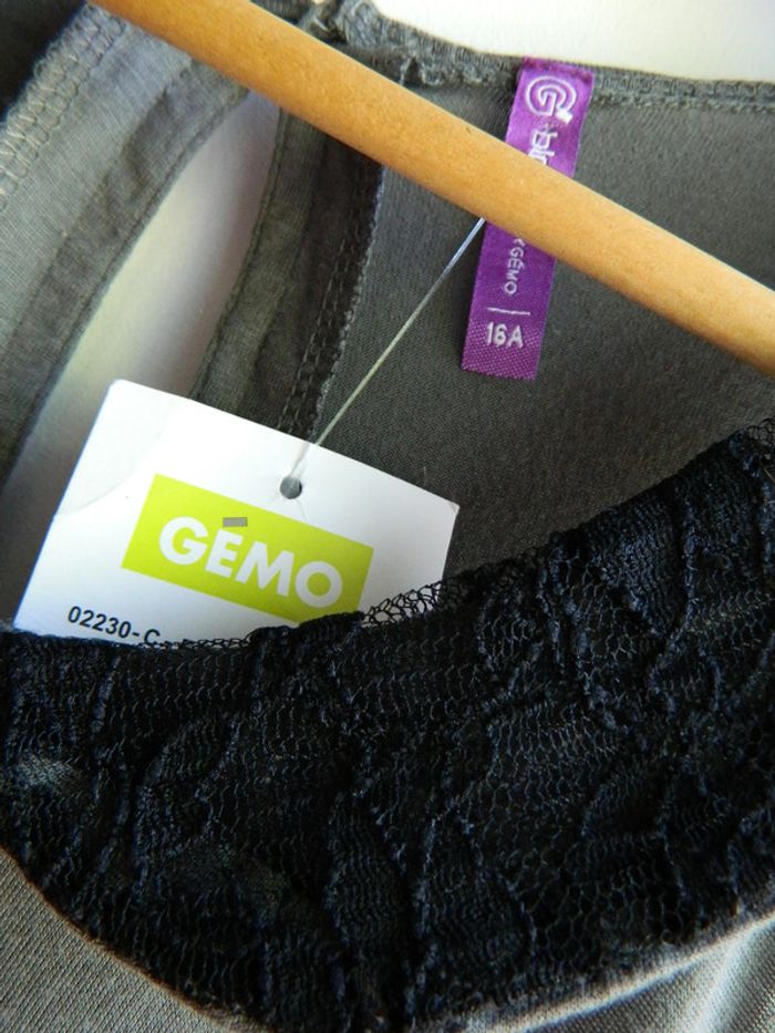 T shirt fille T 16 ans Marque "Gemo" Col Claudine en dentelle noire Le reste est gris foncé Neuf avec étiquette 100% viscose Envoie sous 48h