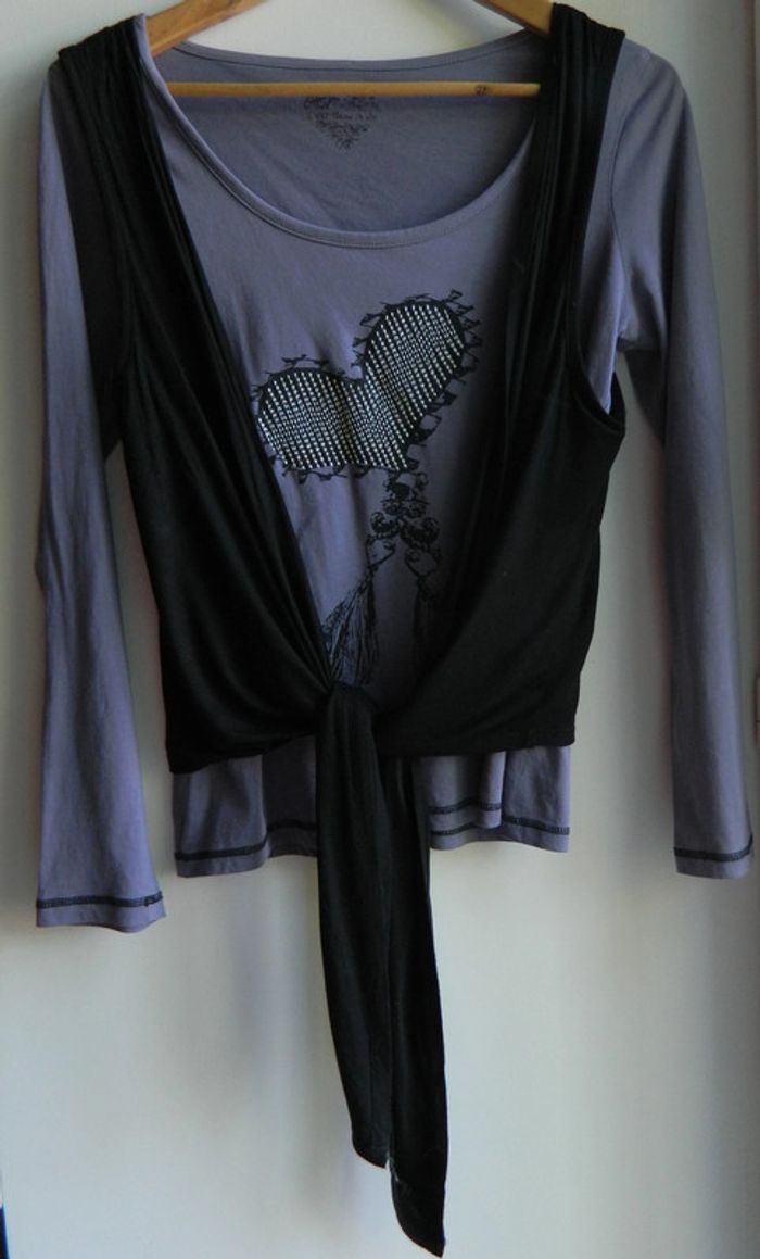 T shirt manches longues T 42/44 Marque "C'est beau la vie" En viscose Le gilet est attaché au t shirt Il se noue ou non ,comme vous voulez Très bon état Envoie sous 48 h