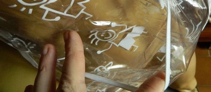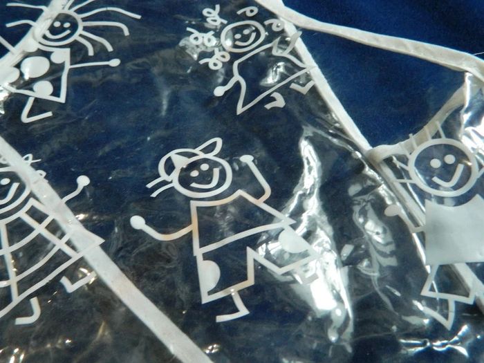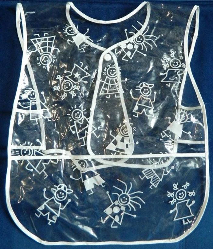 Tablier en plastique souple blanc et transparent pour enfant de la taille 4 ans à 6 ans Se ferme par un bouton pression dans le dos, 1 poche devant. Idéal pour les repas salissant ou les travaux manuels Petites tâches quasiment pas visible(voir photos) Sinon très bon état Envoie sous 48 h