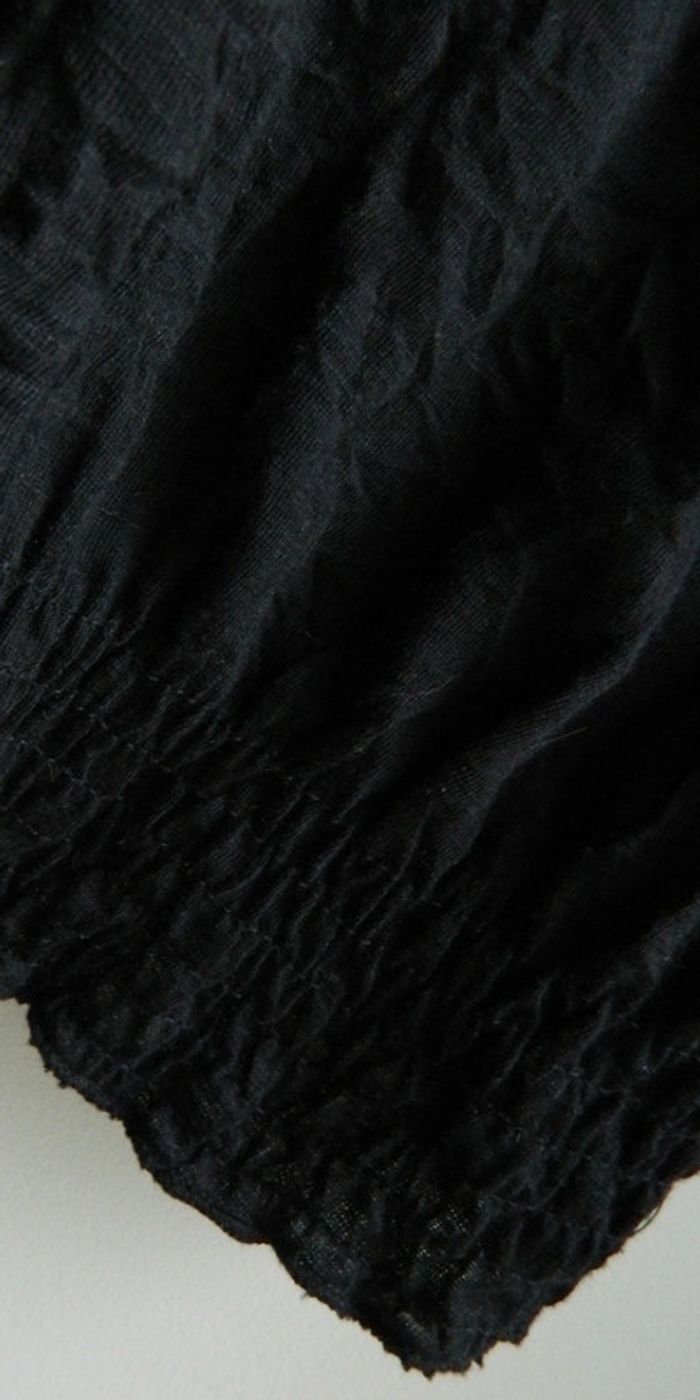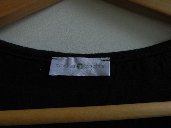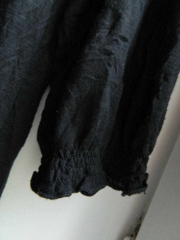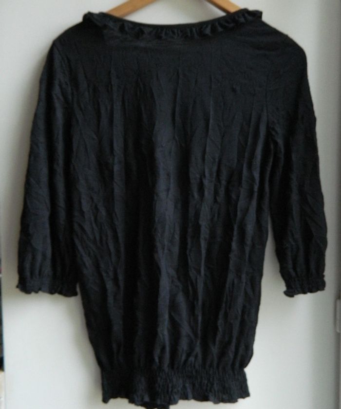Blouse femme T 2 Marque "Cache Cache" Noir uni Col boutonné En polyester Manches 3/4 au bords élastique Volants Froissé naturellement ,pas besoin de repassage Très bon état Envoie sous 48 h