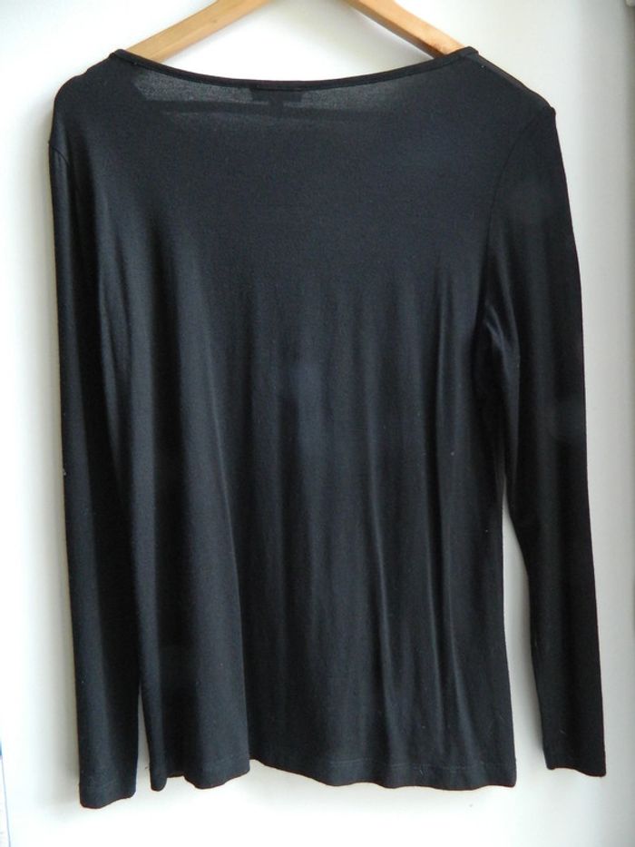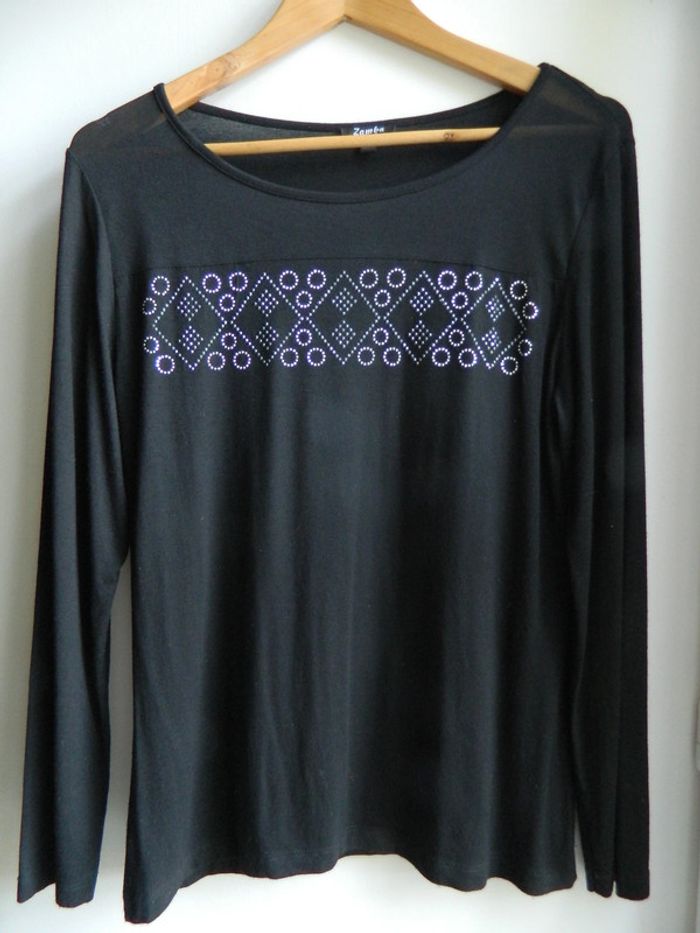 T shirt manches longues T 3 Marque" Zamba" Noir uni avec strass devant Bi matière (Une bande de résille juste au dessus des strass) En viscose et élasthanne Extensible Agréable à porté Très bon état Envoie sous 48 h