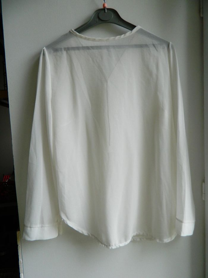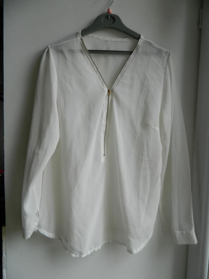 Blouse femme T L Blanche, fermeture éclair doré En polyester écru Manches 3/4 Semi transparente Très bon état Envoie rapide et soigné sou 48h