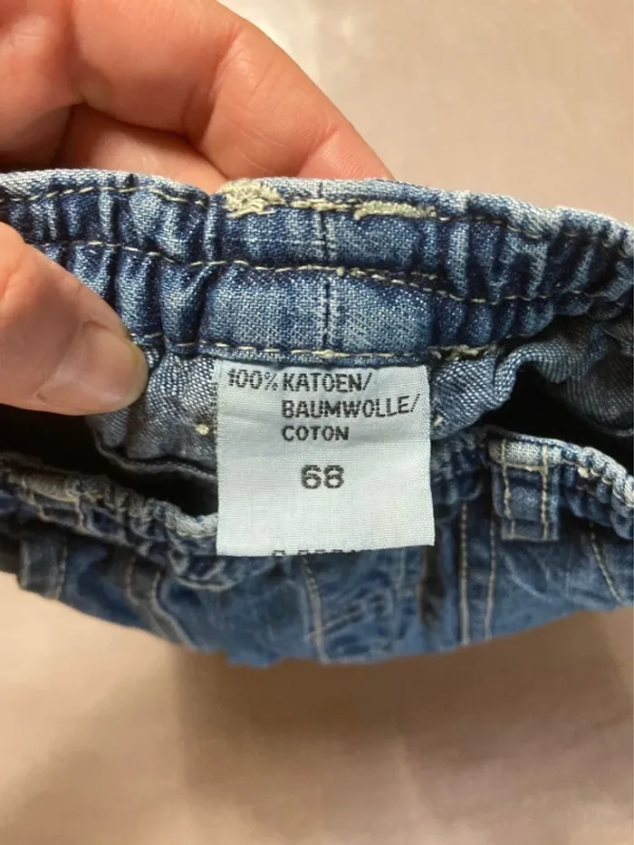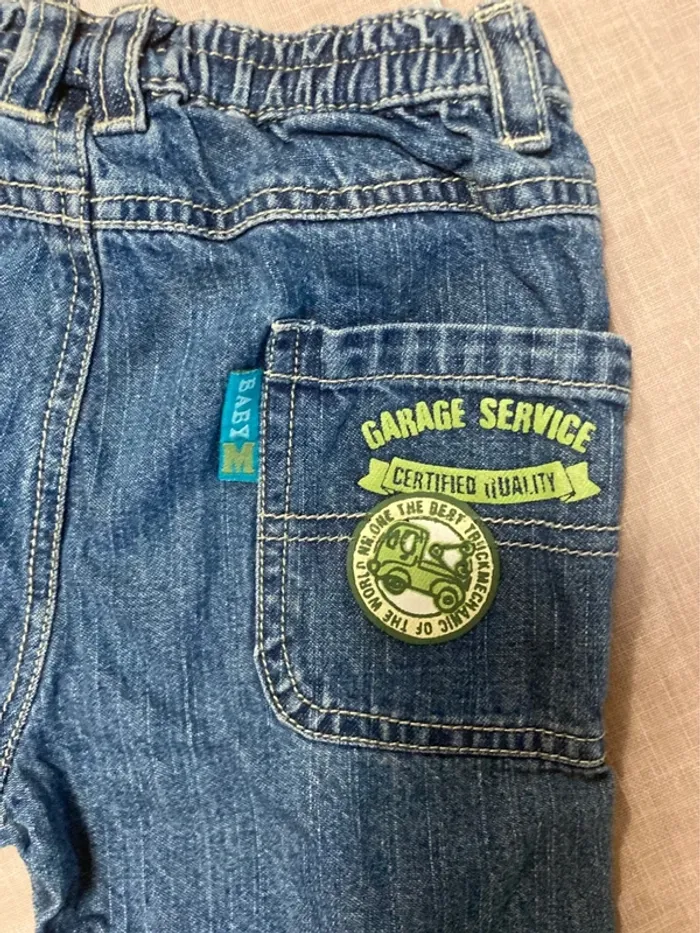 Pantalon en jean souple et confortable pour bébé garçon. Marque Baby M, taille 68 cm (≈ 6 mois). ✨ Détails : • Taille élastiquée pour un bon maintien • 100 % coton • 2 grandes poches à l’avant + 2 poches à l’arrière • au dos “Garage Service – Certified Quality” avec motif tracteur 🚜 • Coupe ample, pratique et agréable à porter #bébé #garçon #pantalon #jean #babym #6mois #modebébé #vetementbebe