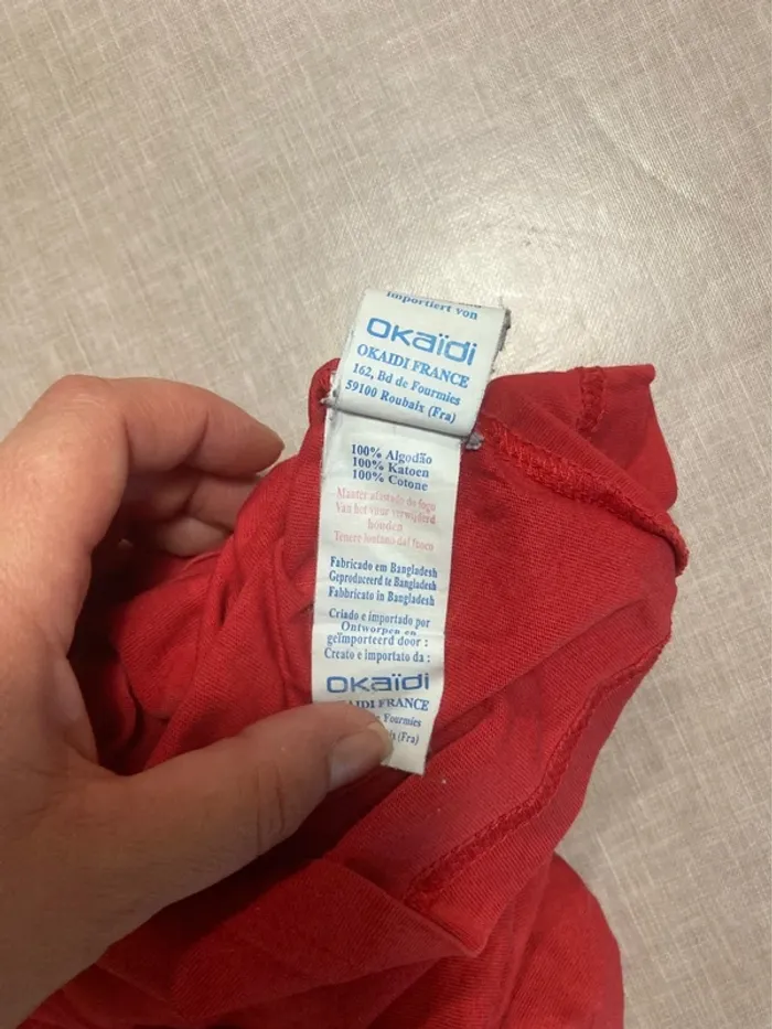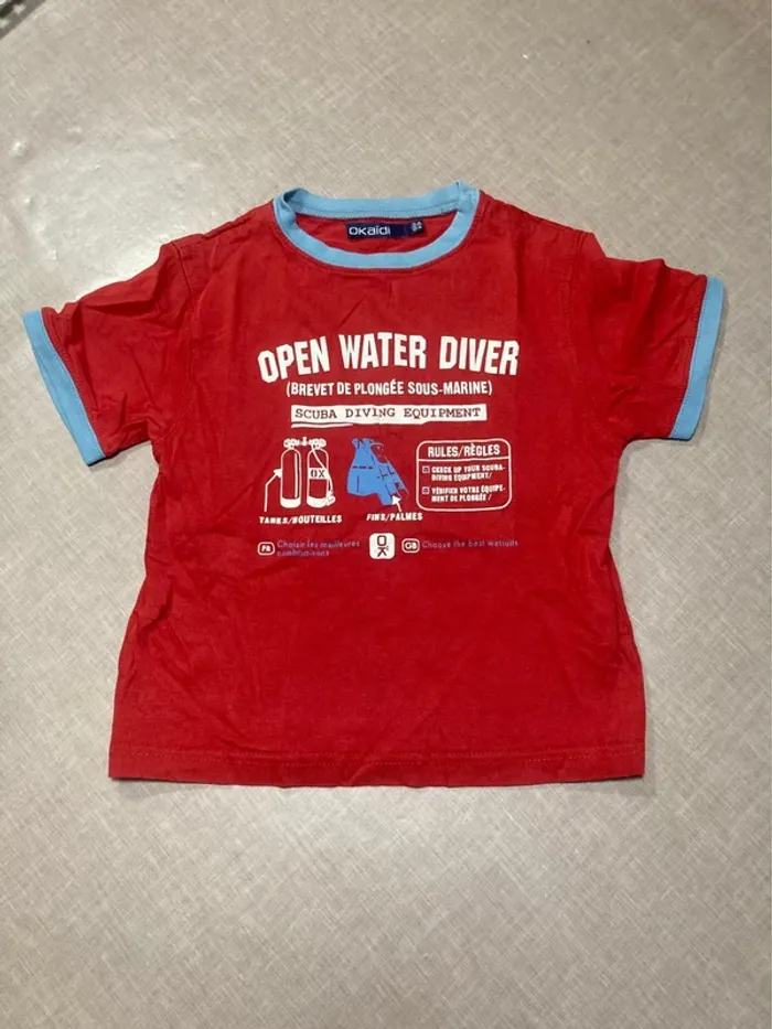 • Taille : 3 ans (94 cm) • Couleur : rouge avec détails bleu clair • Motif : impression “Open Water Diver” (plongée sous-marine) devant • Matière : 100 % coton • Marque : Okaïdi #okaidi #tshirtgarcon #tshirt3ans #modeenfant #vetementenfant #vetementsbebe #garcon3ans #lookdetente #vetementoccasion #plongee #rougeetbleu #enfantmode #petitprix #videgrenierenfant