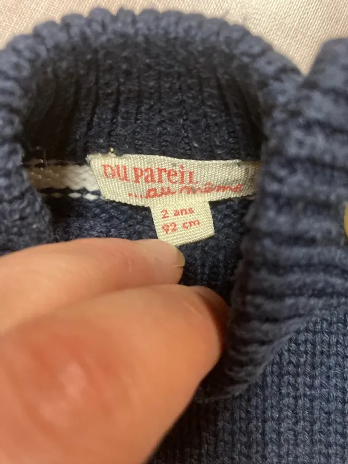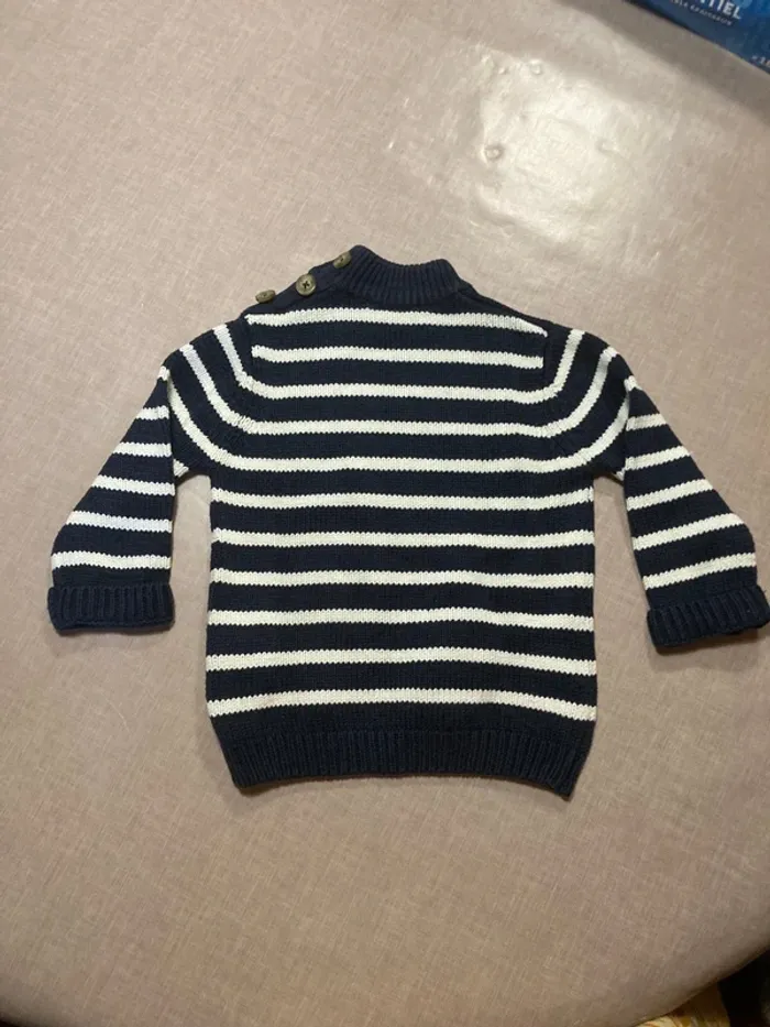 Adorable pull marinière à rayures bleu marine et blanc de la marque Du Pareil au Même (DPAM). • Taille : 2 ans (92 cm) • Composition : 59% coton, 41% acrylique • Boutons sur l’épaule pour un habillage facile • Style marin classique et confortable 📌 idéal pour la mi-saison. #pullbébé #marinière #DuPareilAuMême #DPAM #bébé2ans #modebébé #vêtementbébé #lookmarin #pullenfant