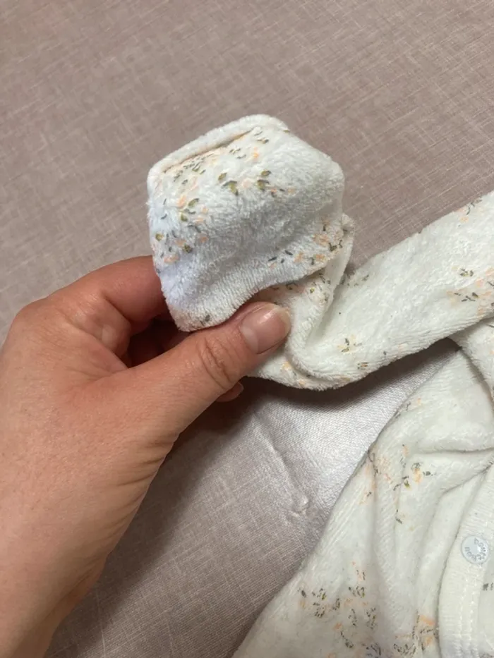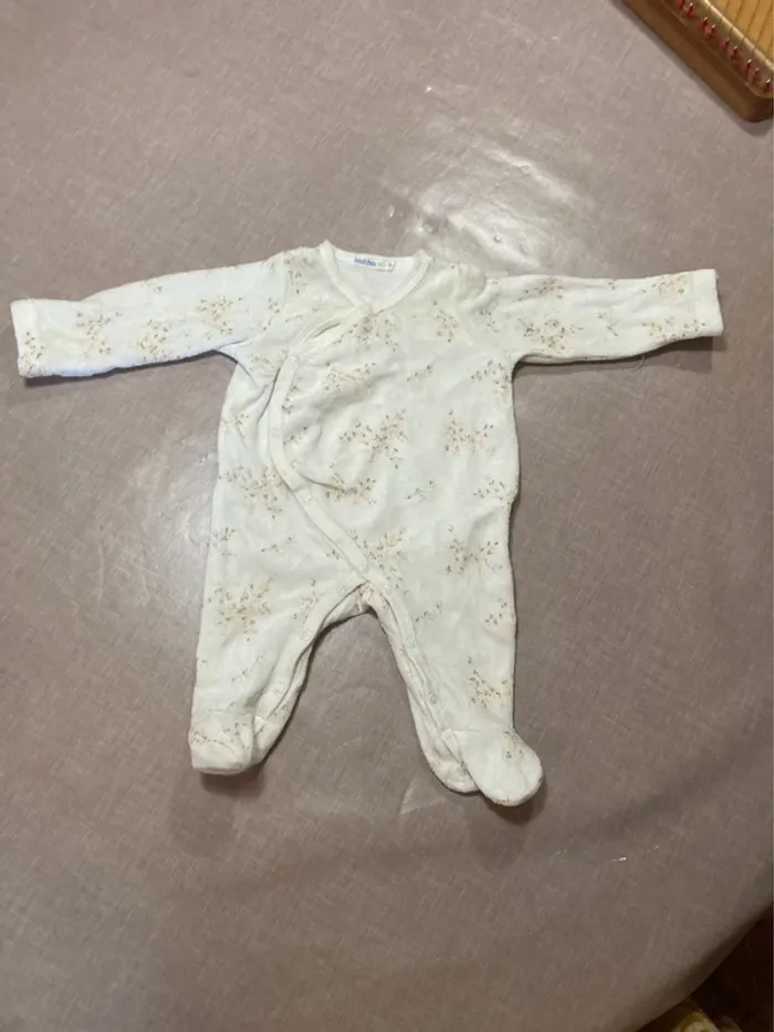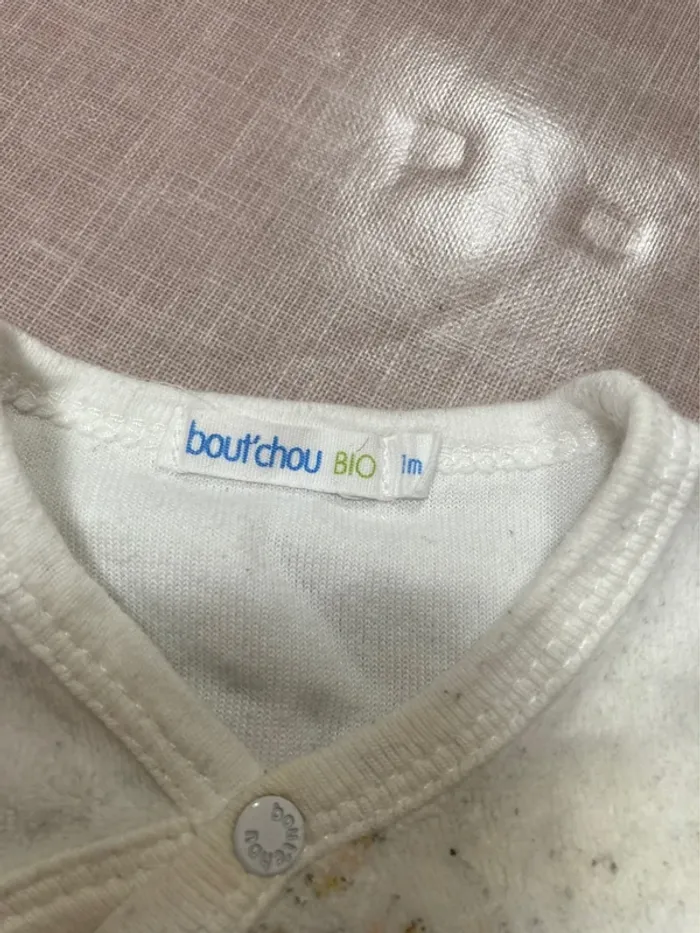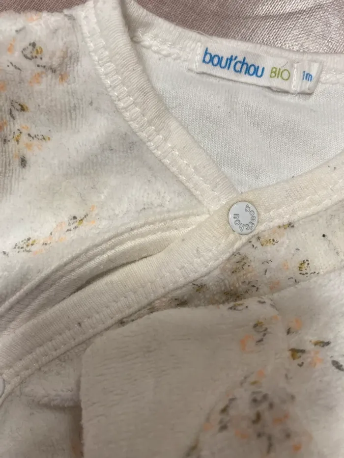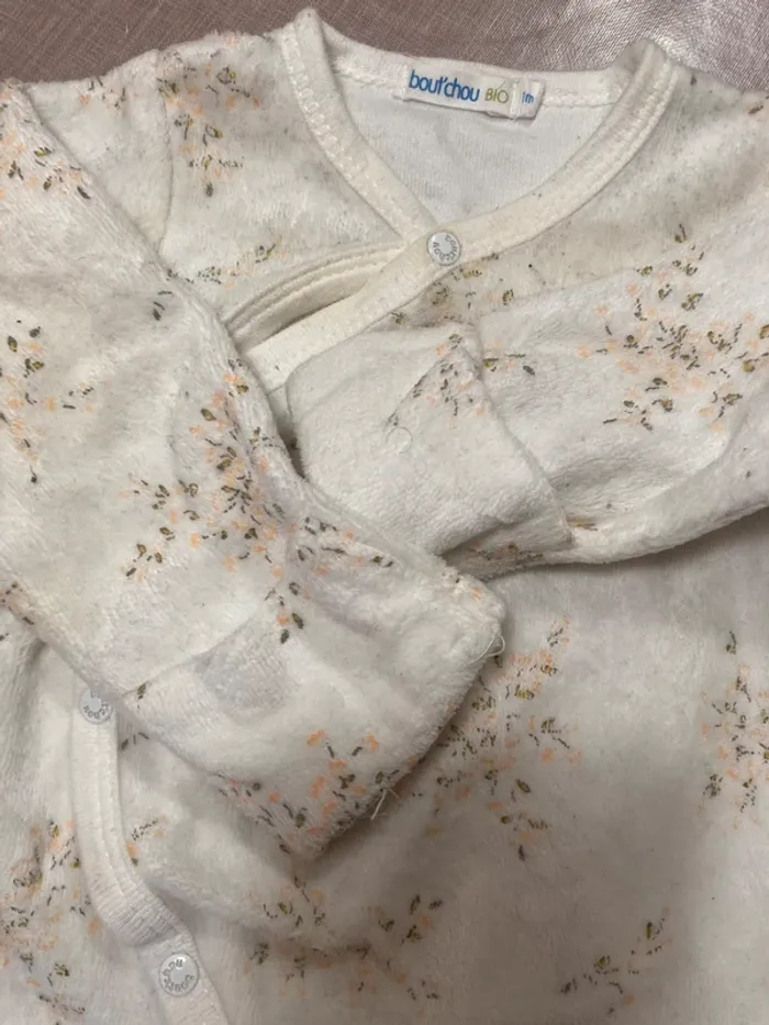 Adorable pyjama croisé en velours tout doux de la marque Bout’chou (Monoprix), en coton bio. Motif fleuri délicat dans des tons pastel. Pratique grâce à son ouverture croisée à pressions. 👉 Les manches se retroussent pour se transformer en moufles, parfait pour protéger bébé. 🔎 À noter : une petite tache jaunâtre près du col (voir photo). 📏 Taille : 1 mois 💡 Matière : coton bio, velours doux 👶 Confortable et chaud pour la mi-saison et l’hiver. #pyjamabebe #boutchou #monoprix #cotonbio #bebe #1mois #vetementbebe #pyjama #mixte #layette #occasion