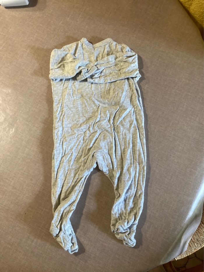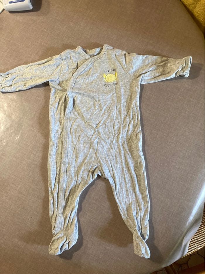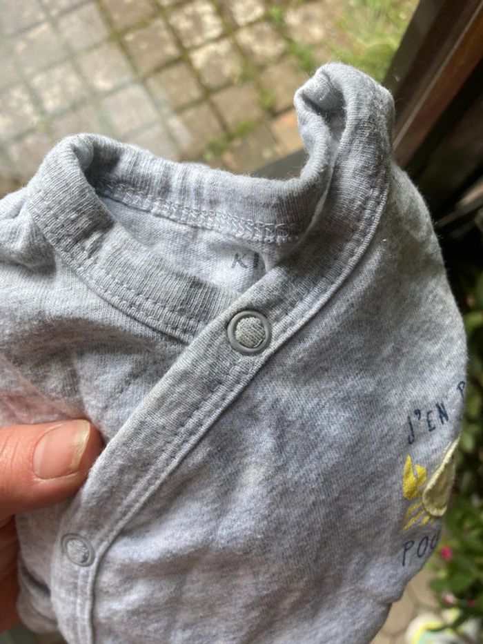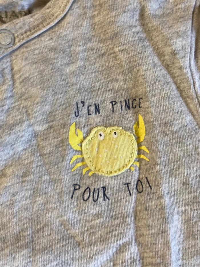 Adorable pyjama gris en coton tout doux de la marque KIABI, taille 9 mois (69-72 cm / 9 kg). • Fermeture croisée à pressions très pratique • Motif crabe jaune brodé avec l’inscription « J’en pince pour toi » • Pieds intégrés pour garder bébé bien au chaud • En très bon état (petit tache autour du bouton pression du haut - voir photo) Parfait pour les nuits d’été ou à glisser sous une gigoteuse. #kiabi #pyjamabébé #bébégarçon #9mois #modebébé #pyjamagris #tropmignon #petitlook