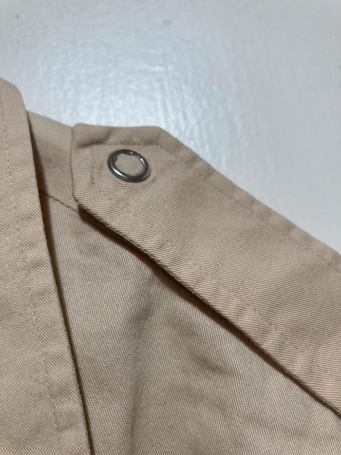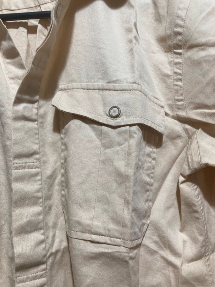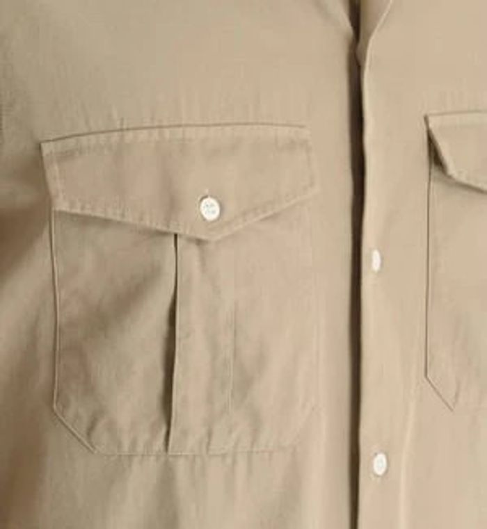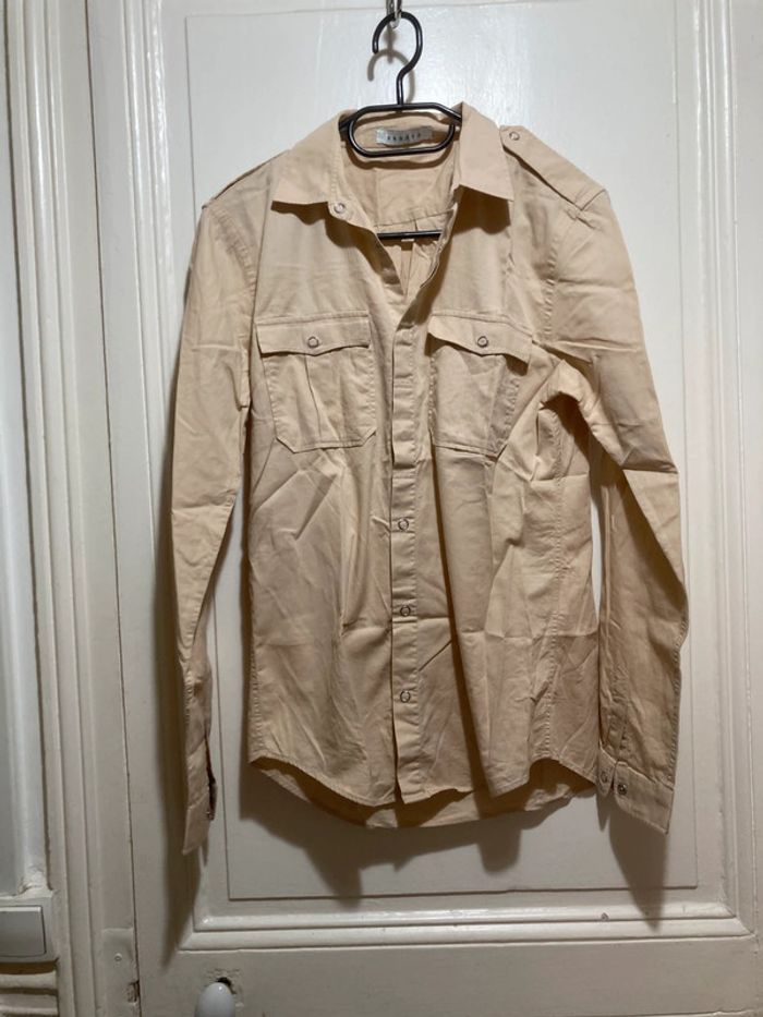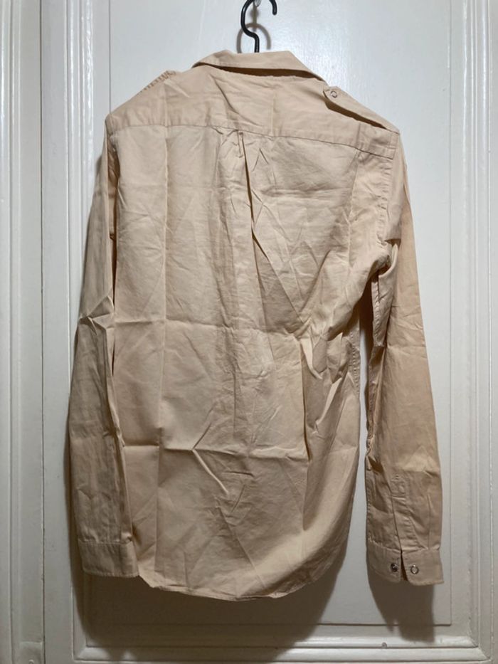 Chemise saharienne en coton épais, coupe ajustée. Couleur beige clair. Détails soignés : col italien, deux poches à rabat sur la poitrine, pattes aux épaules et poignets ronds à un bouton. Fermeture boutonnée. Base légèrement arrondie. Très bon état. Taille S – 100 % coton. #sandrohomme #chemisesaharienne #chemisehomme #chemisesahara #chemisesandro Image générée par intelligence artificielle pour visualiser le porté. Seule la première image de l’annonce est générée, les autres montrent le produit réel.