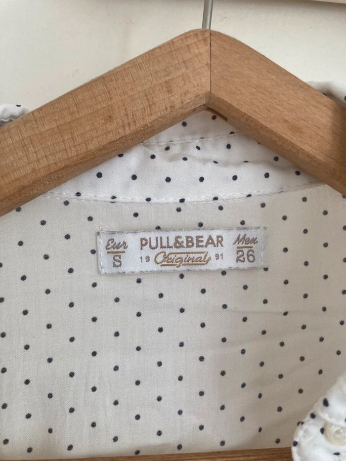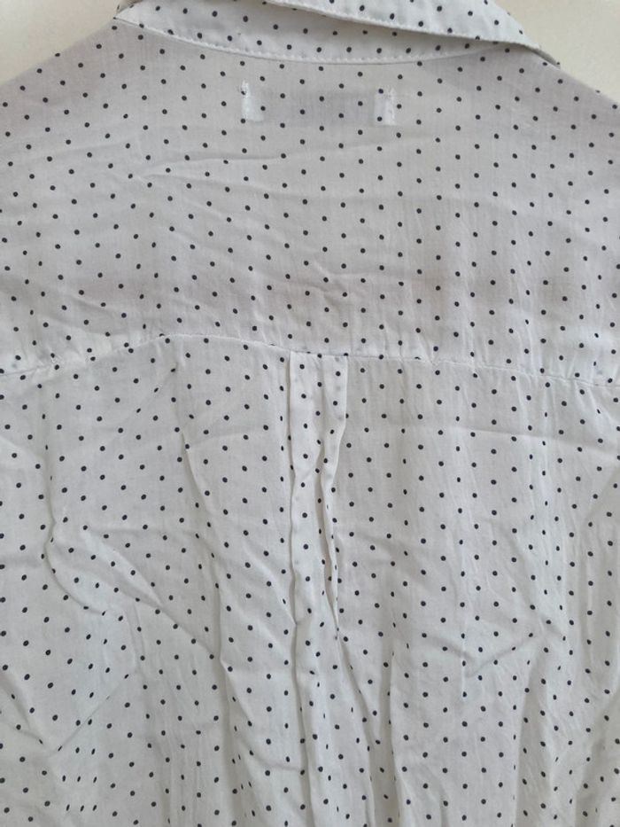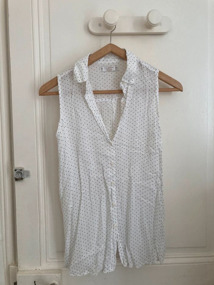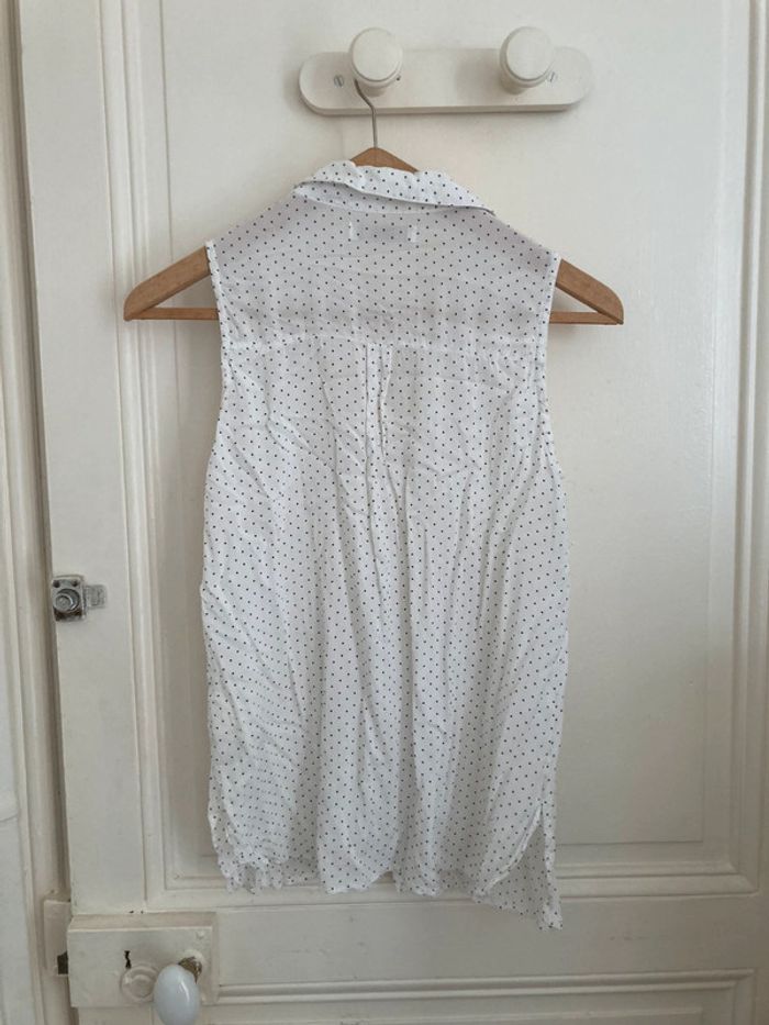 Jolie chemise blanche sans manches, imprimée de petits pois noirs, de la marque Pull&Bear. Coupe droite légèrement fluide, matière agréable à porter. Idéale pour les beaux jours ou superposée sous un pull léger. Taille S – Convient à un 36. Portée mais en bon état. #pullandbear #chemisefemme #pois #topblanc #minimaliste #lookdujour #vintedfindujour #secondevie #été #petitprix