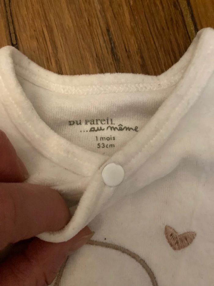 Pyjama tout doux en velours Du Pareil Au Même (DPAM), taille 1 mois (53 cm). ✨ Détails du produit : • Matière ultra confortable et chaude • Ouverture pressionnée sur le devant pour un habillage facile • Motif brodé adorable avec des animaux (hérisson, renard, etc.) • Couleur : blanc écru ✅ État : Très bon état #PyjamaBébé #DuPareilAuMême #BébéConfort #VêtementsBébé #SecondeMainBébé #ModeBébé #BébéChic